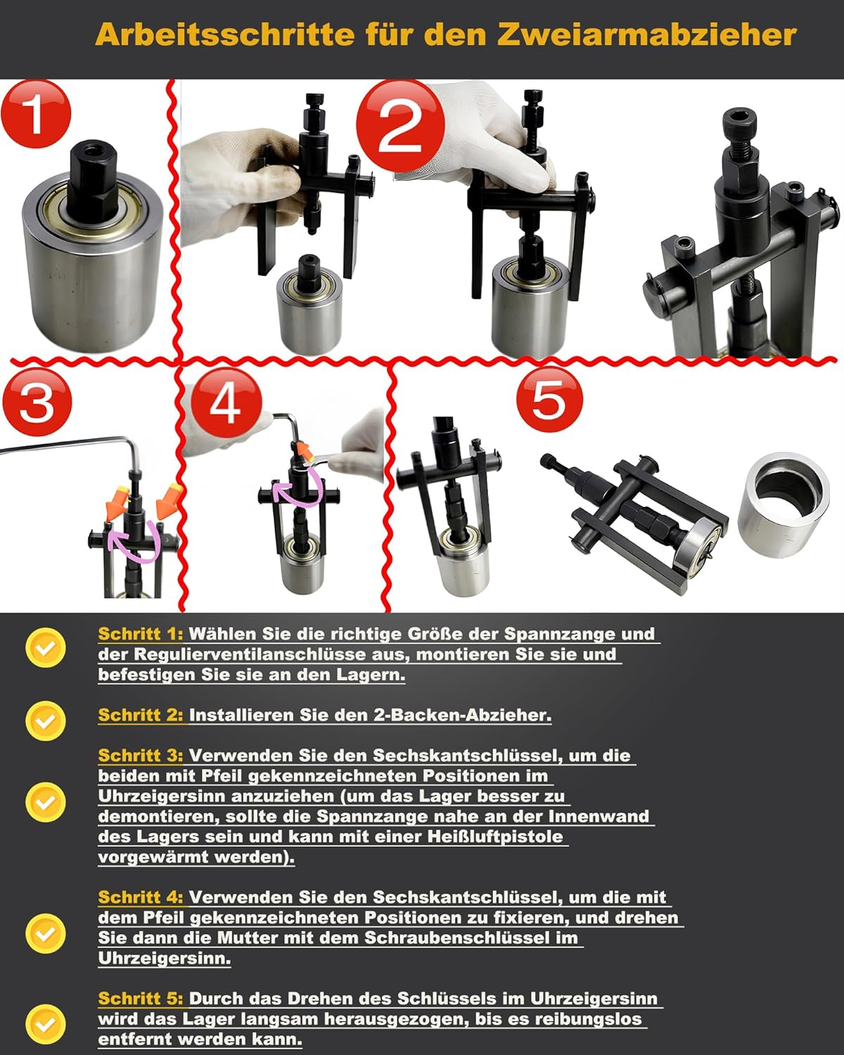 • Upgrade Lagerabzieher mit Zweibackenabzieher: Zur besseren Nutzung des Zweibackenabziehers und zur Demontage der Lager können die Beläge am Zweibackenabzieher entsprechend vergrössert oder verkleinert werden, um eine geeignete Position zu erreichen.