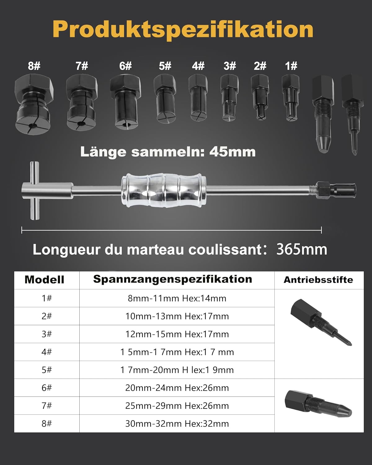 • Verstellbar und mehrere Grössenoptionen (8-32mm):Es gibt zwei unterschiedlich grosse Antriebsstifte, wobei der kleinere für die 5 Spannzangen von 8mm bis 20mm passt und der grössere Antriebsstift für die 3 grösseren Spannzangen von 20mm bis 32mm