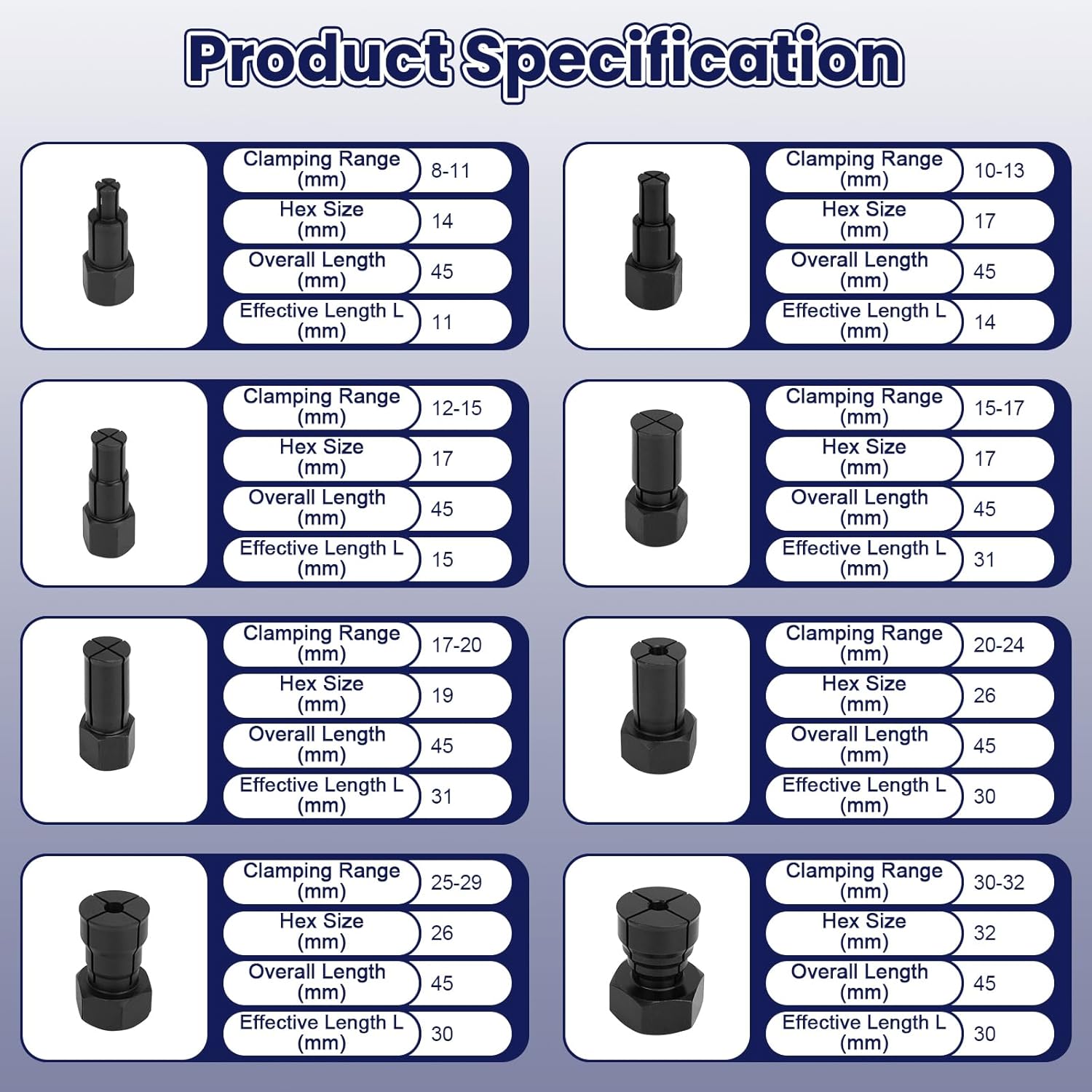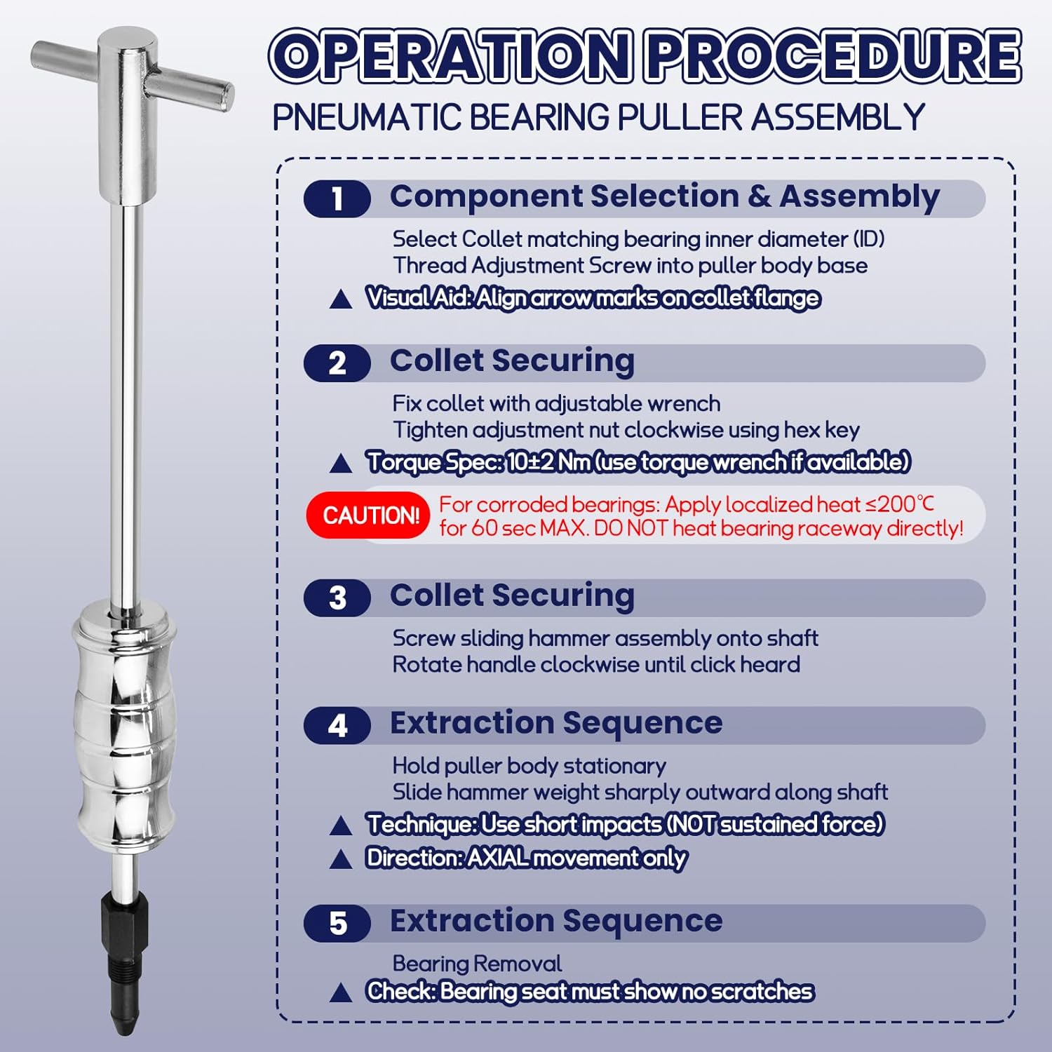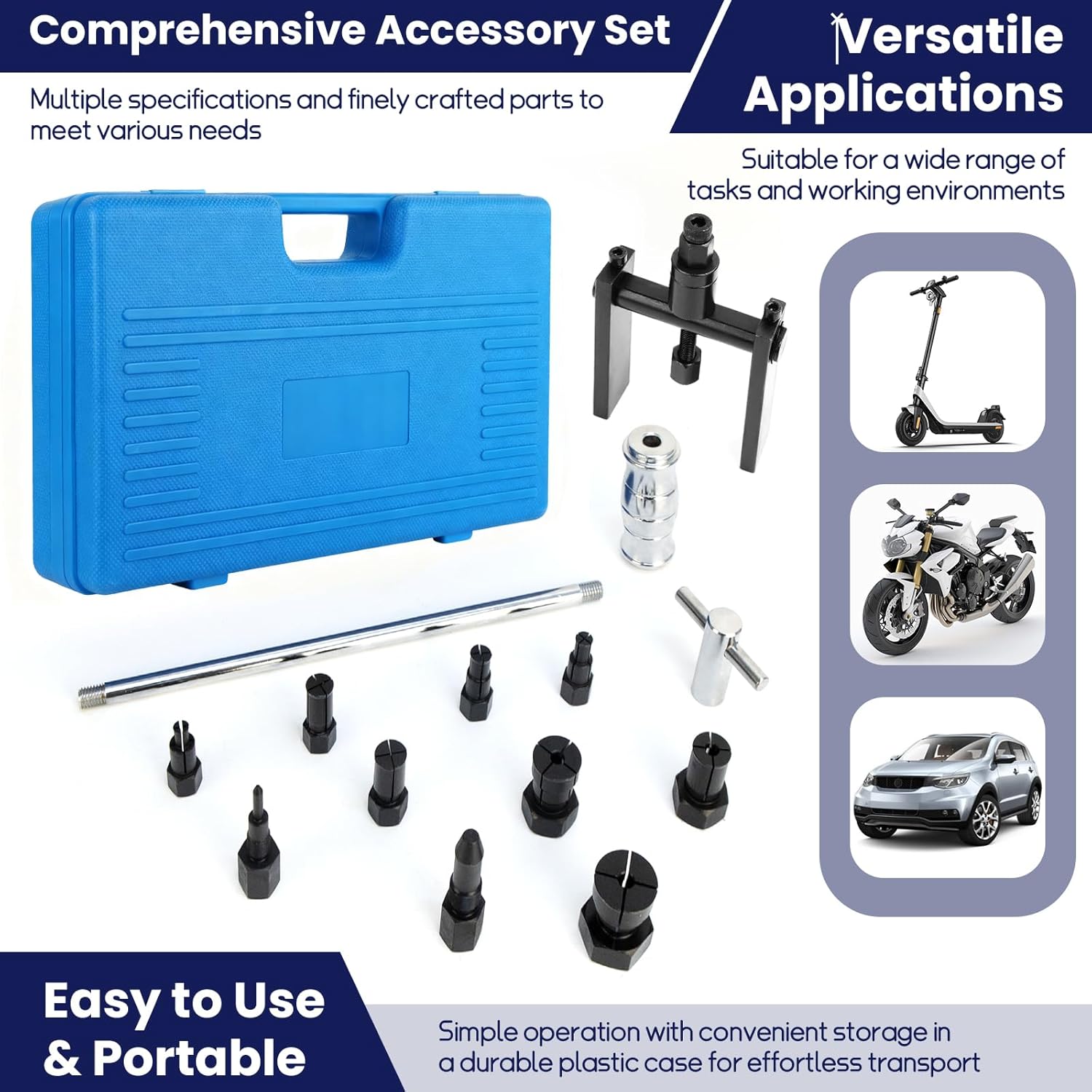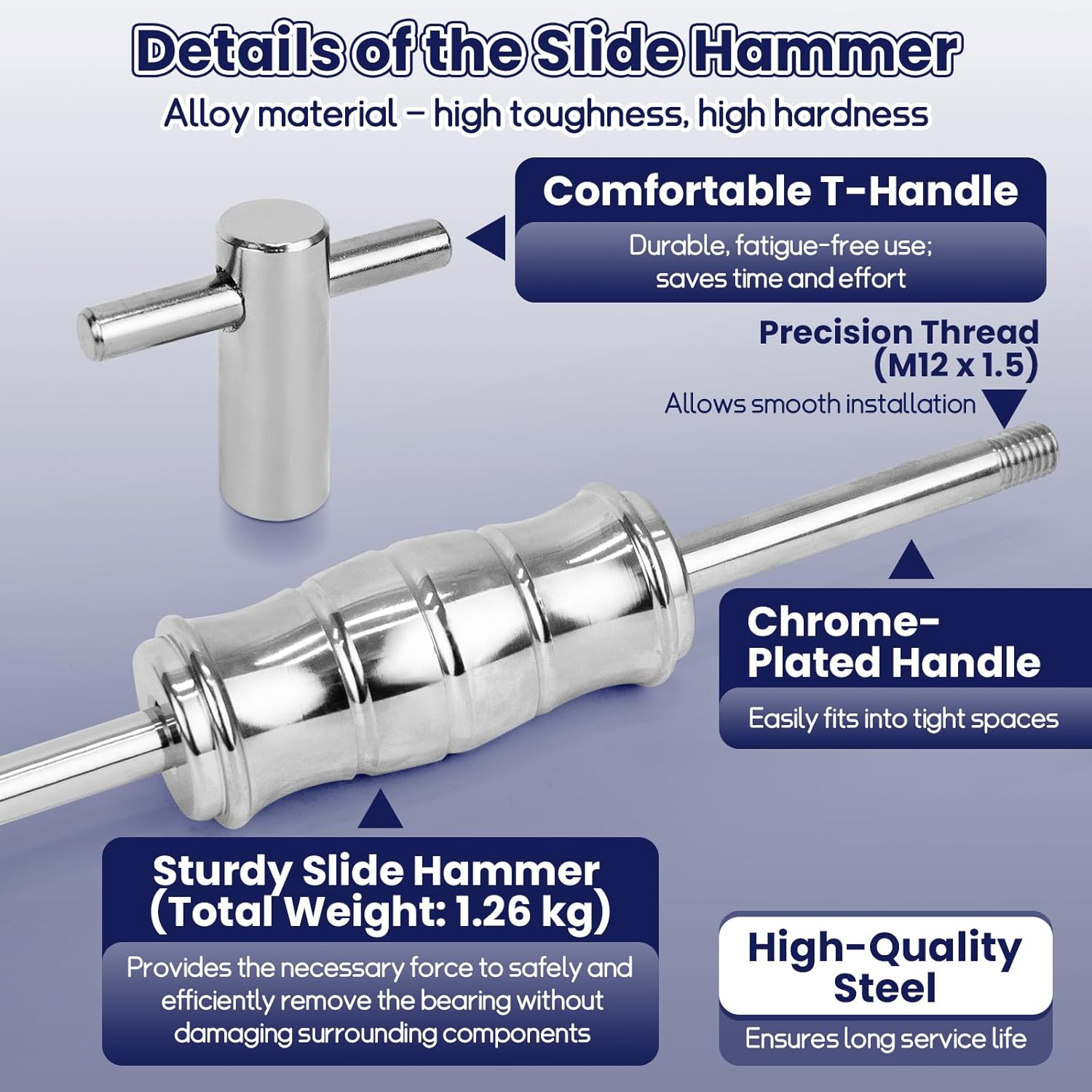 - 12-TEILIGES INNENLAGER ABZIEHER SET MIT GLEITHAMMER: Das Set besteht aus einem 36 cm langen Gleithammer, 8 ausdehnbaren Spannzangen (8–32 mm), zwei Antriebsstiften und einem Zweiarm-Abzieher. Es eignet sich für den Ausbau von Innenlagern, Kugellagern