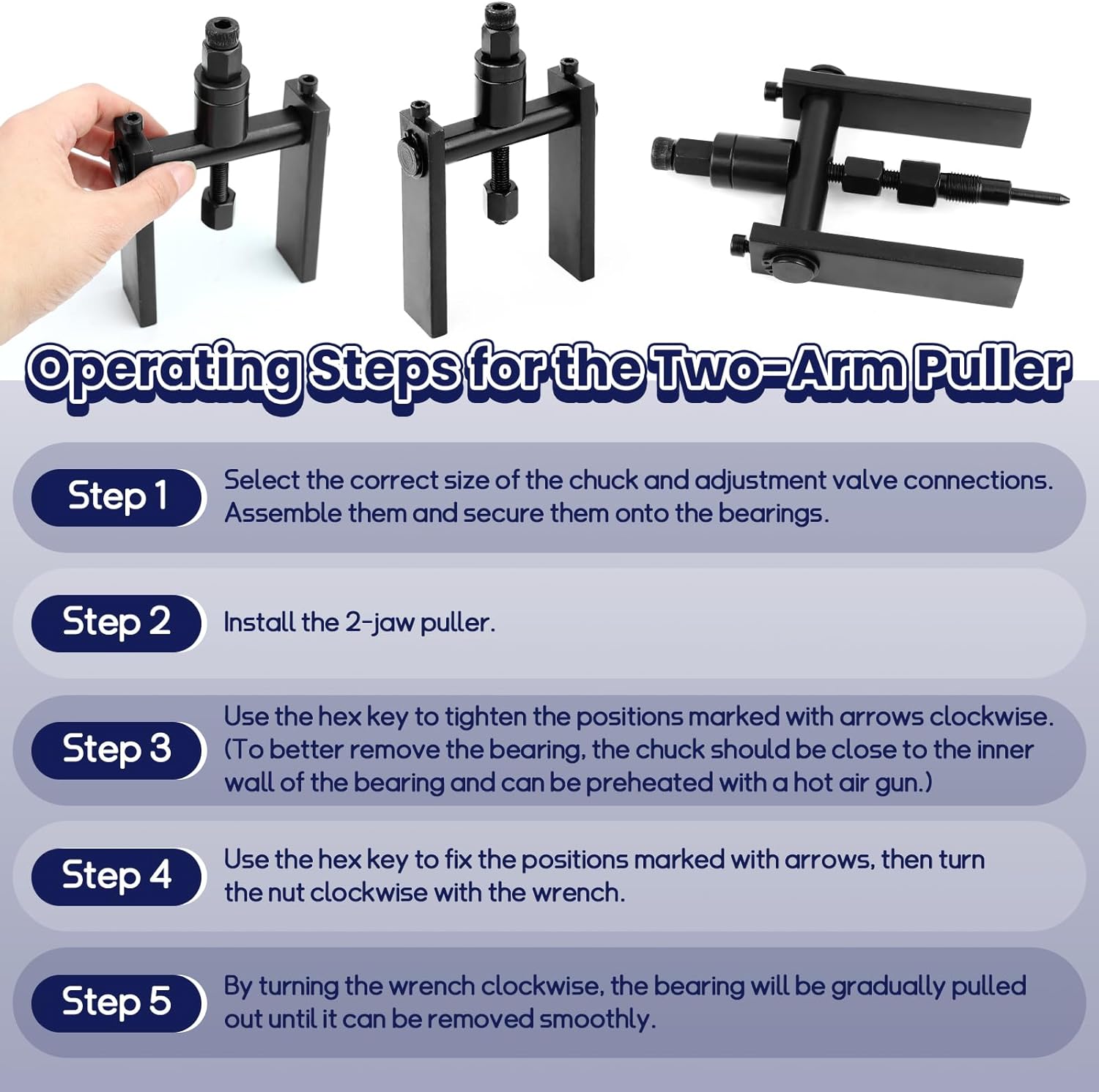 - ZWEIARM-ABZIEHER MIT GEWINDESPINDEL UND 25–65 MM SPANNBEREICH: Der mitgelieferte Zweiarm-Abzieher kann in der Spannweite von 25 bis 65 mm verstellt werden. Die Hakenarme lassen sich je nach Lagergrösse anpassen, um die ideale Position zu erreichen.