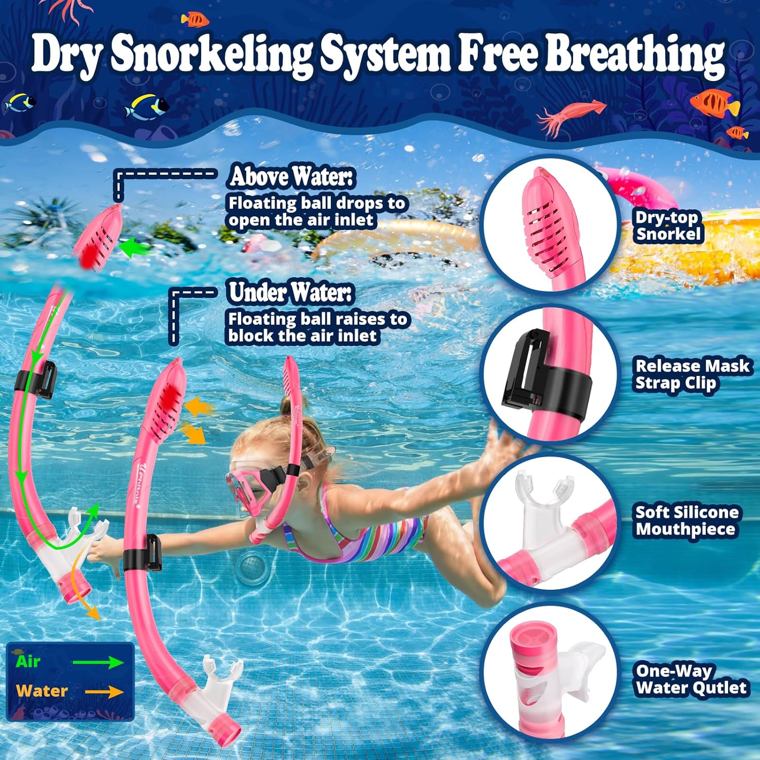 • Trockenes Top-Design sichert die Sicherheit von Kindern: Das Schnorchelset verhindert das Eindringen von Wasser beim Tauchen mit einem Trockenventil-Design. Das Kugelventil an der Spitze, das verhindert, dass bei Wellengang oder beim Tauchen Wasser in