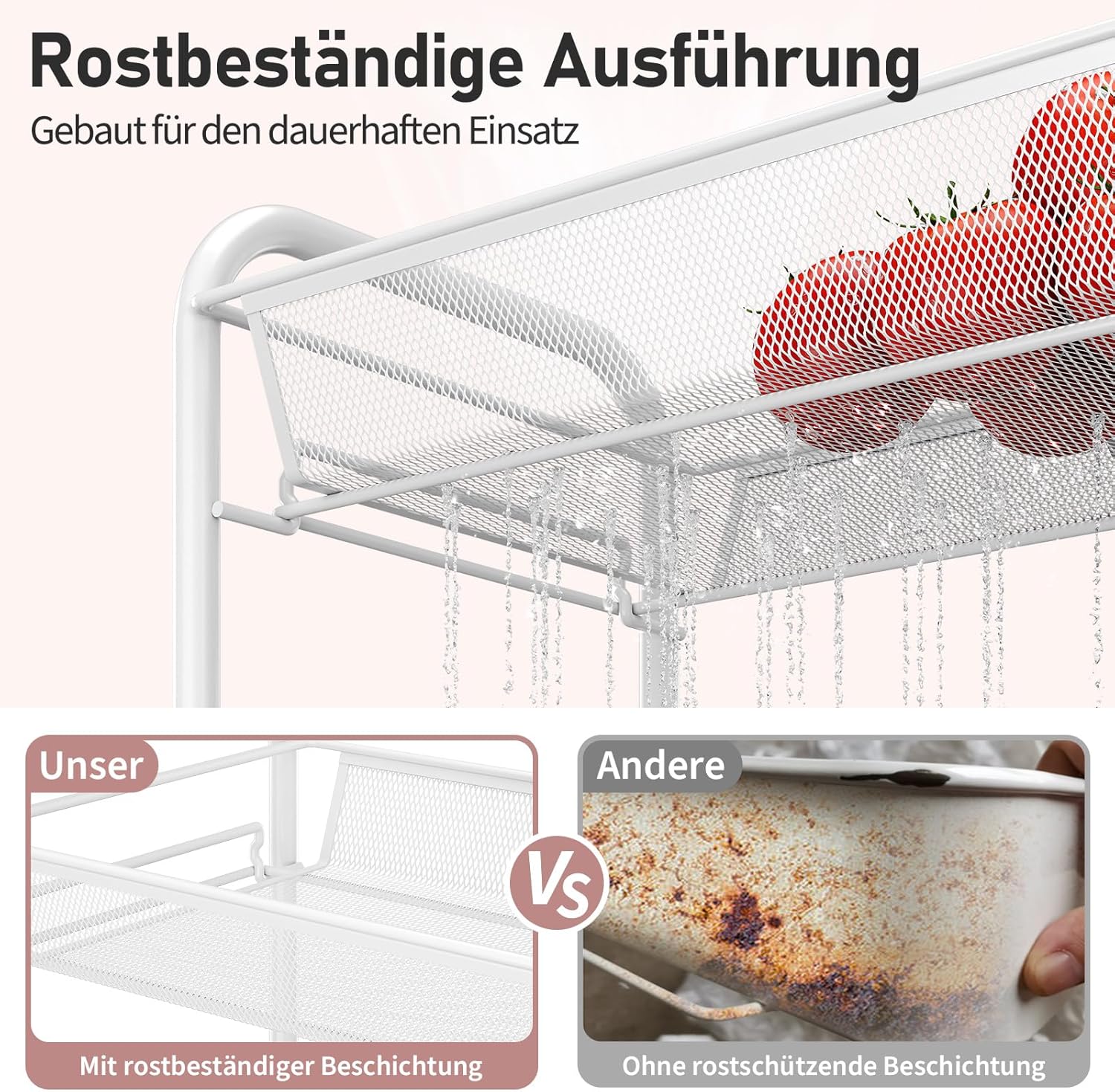 • 【Atmungsaktiver Netzkorb】Der rollende Servierwagen von Urackify ist mit einem atmungsaktiven Netzkorb ausgestattet, der effektiv Verderb verhindert oder verlangsamt und auch das Abtropfen erleichtert. Der Korb hat eine erhöhte Kantenhöhe von 6 CM,