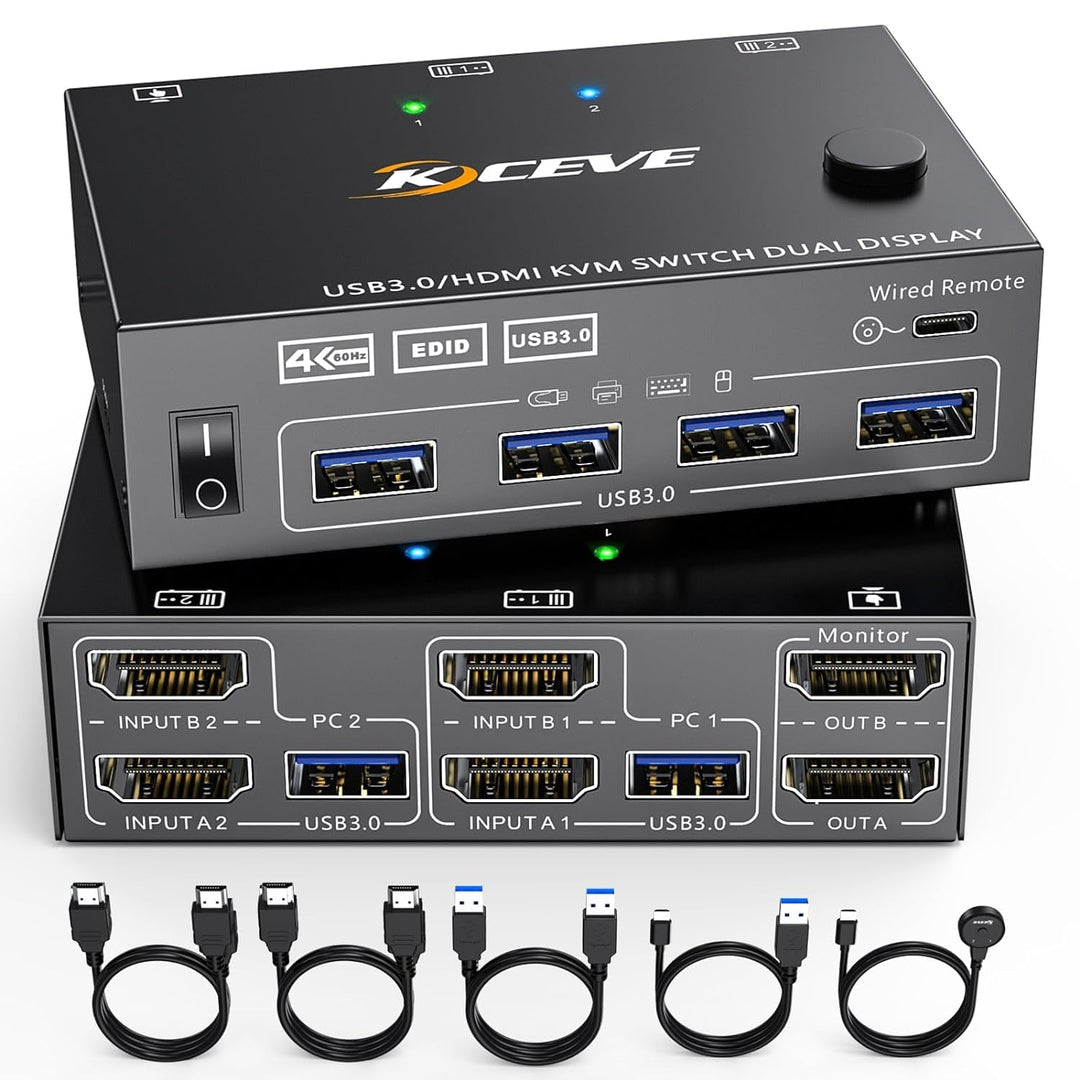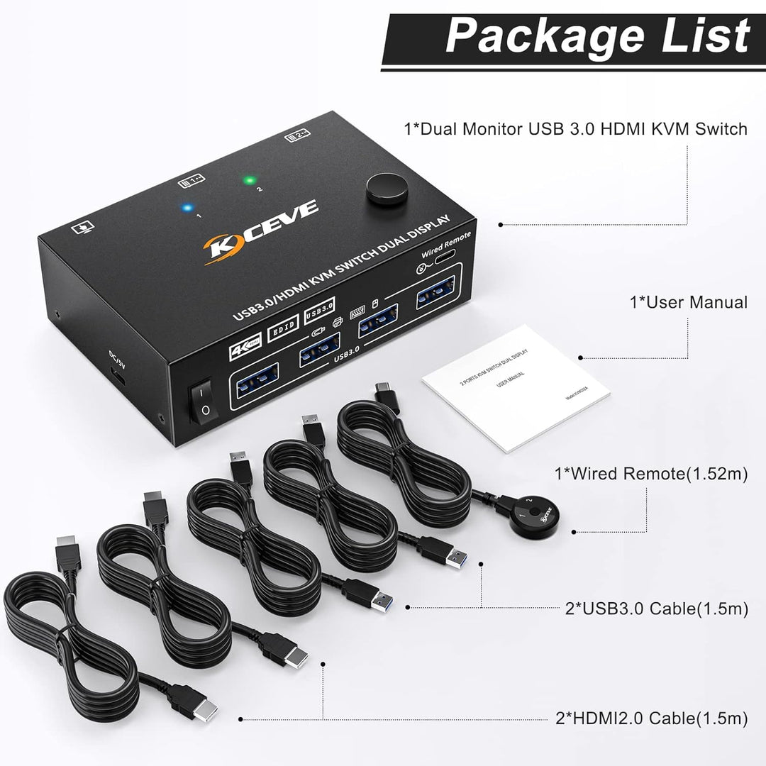 - 【Dual Monitor KVM USB 3.0 Switch】Dieser Dual Monitor HDMI KVM Switch kann 2 Monitore teilen, indem er 2 Computer mit 1 Satz USB-Tastatur und -Maus steuert. Im Kopiermodus kann der Hauptbildschirm auf den Nebenbildschirm kopiert werden. Im erweiterten