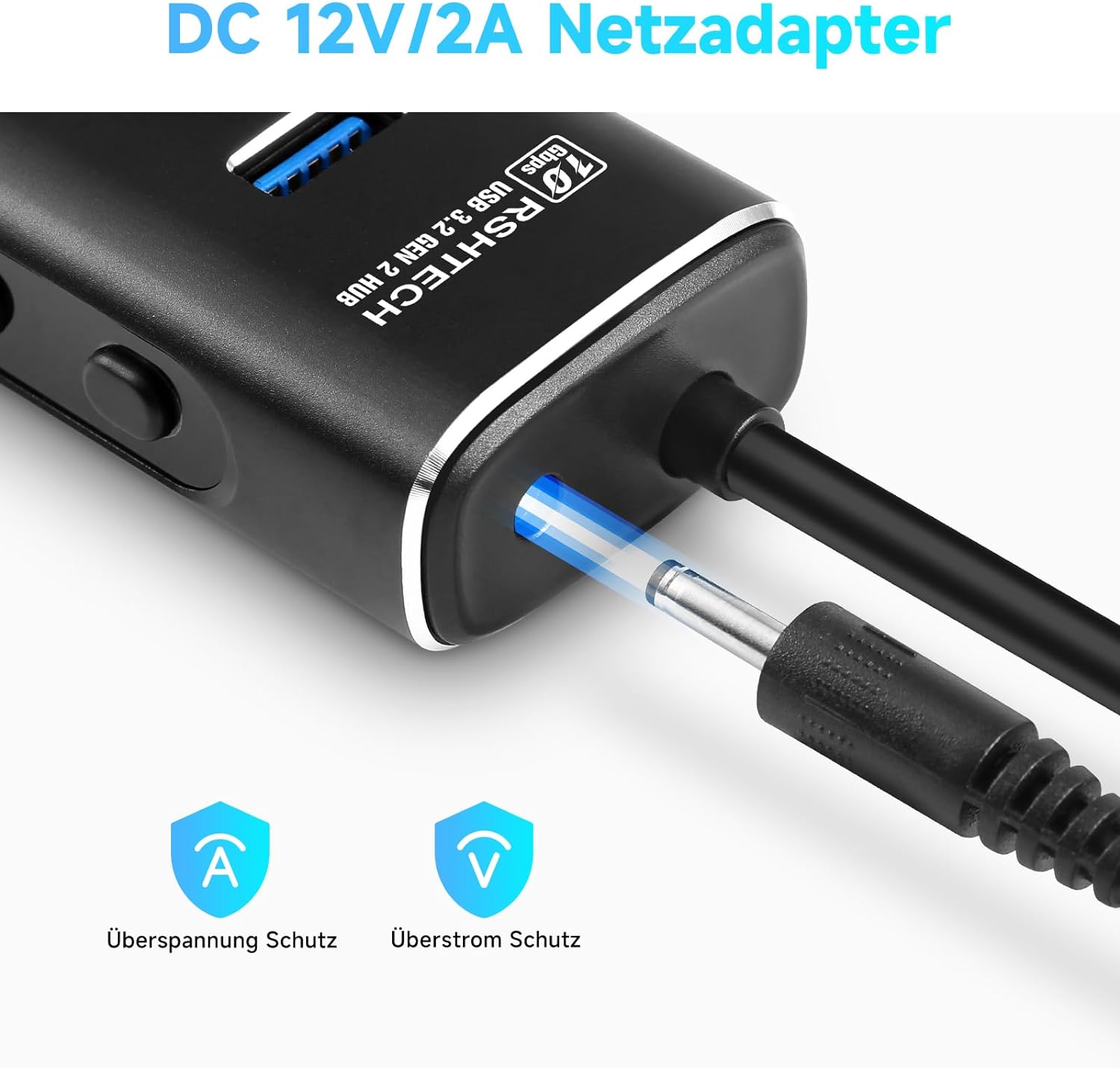 - 【Was Sie erhalten】RSHTECH 7-Port USB 3.1/3.2 Gen2 Hub; 100cm 2-in-1 USB Kabel x 1; 24W (12V/2A) Netzteil x 1; Bedienungsanleitung x 1; Professioneller Kundenservice.