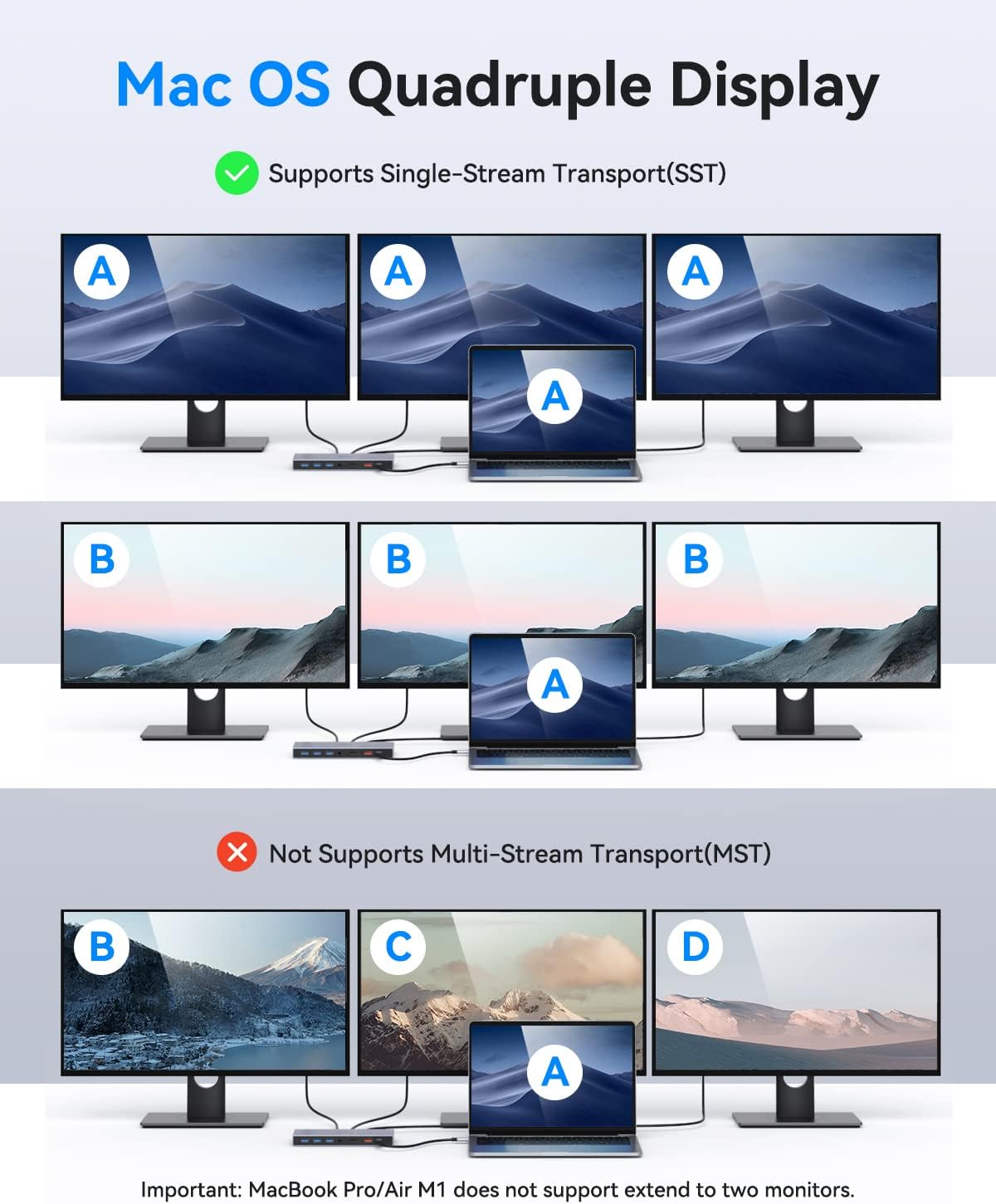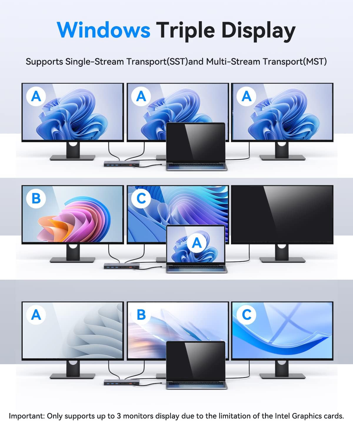- Triple Display & 4K Output Docking Station für Laptop Erweiterung: Die USB-C Dockingstation ermöglicht den einfachen Zugriff auf zwei oder drei externe HD-Monitore oder einen einzelnen 4K Monitor. Bei Verwendung von HDMI 1 oder DP-Videoport, max. bis