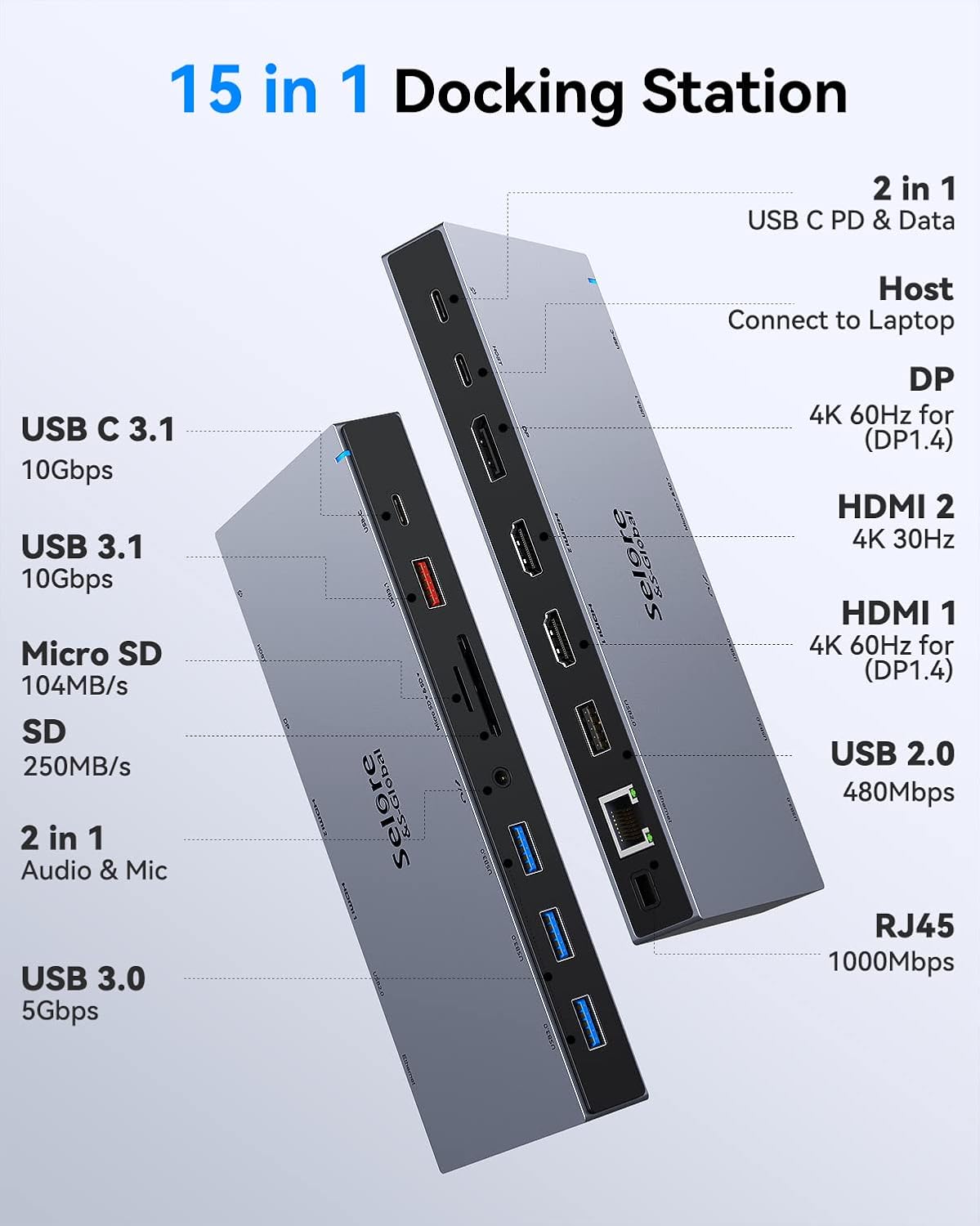 - 15 IN 1 Dreifach-Display Laptop-Dockingstation: Mit dieser Plug-and-Play-Dockingstation mit zwei Monitoren können Sie Ihren Laptop ganz einfach von einem Typ C/Thunderbolt 3/4-Anschluss auf 15 Anschlüsse erweitern. Diese Dockingstation mit 3 Monitoren