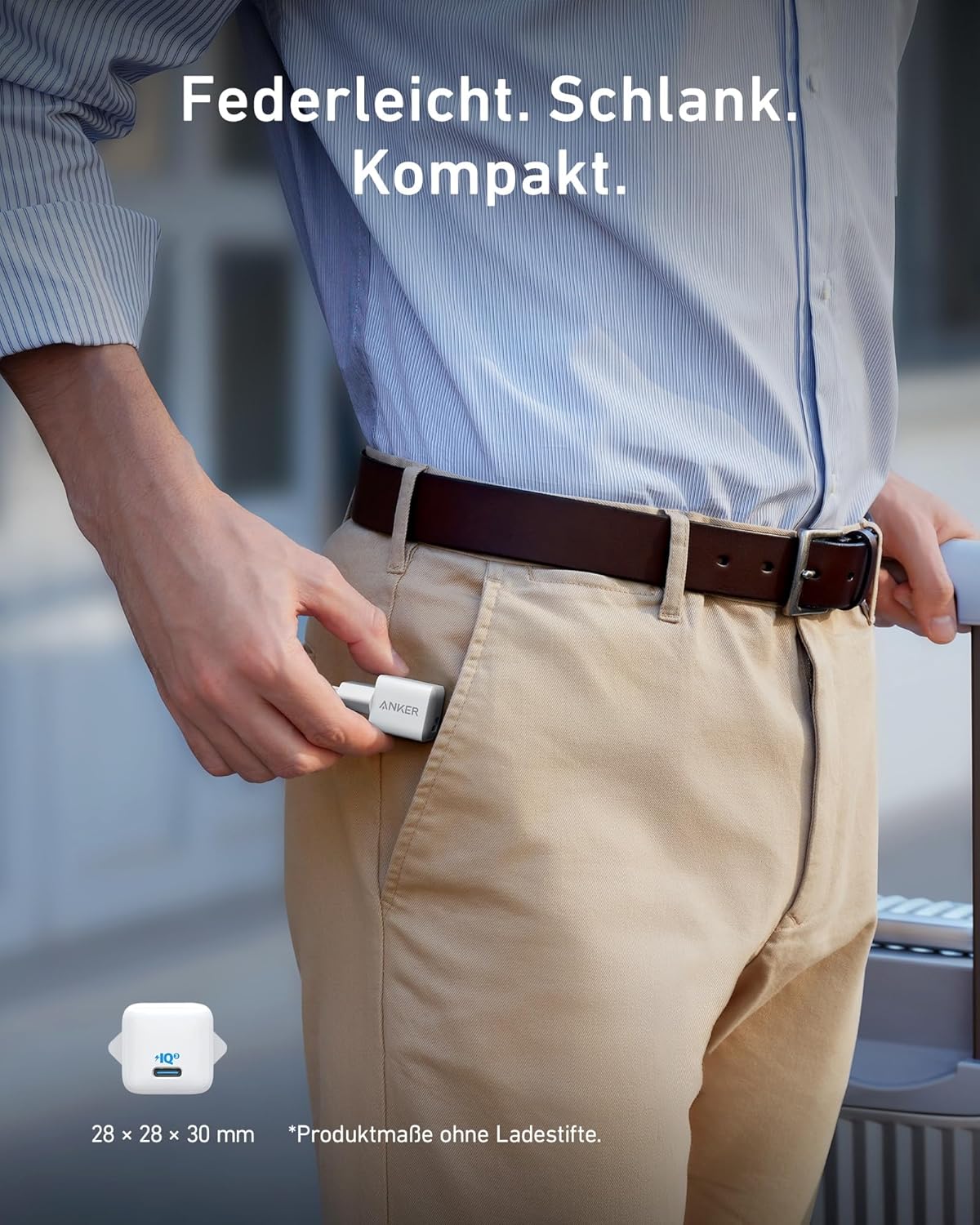 - Platzsparendes, kompaktes Design: Mit nur der Hälfte der Grösse eines Standard-iPhone-Ladegeräts mit 20W bietet der Anker Nano mehr Leistung und spart gleichzeitig Platz in deiner Tasche oder an der Wandsteckdose.