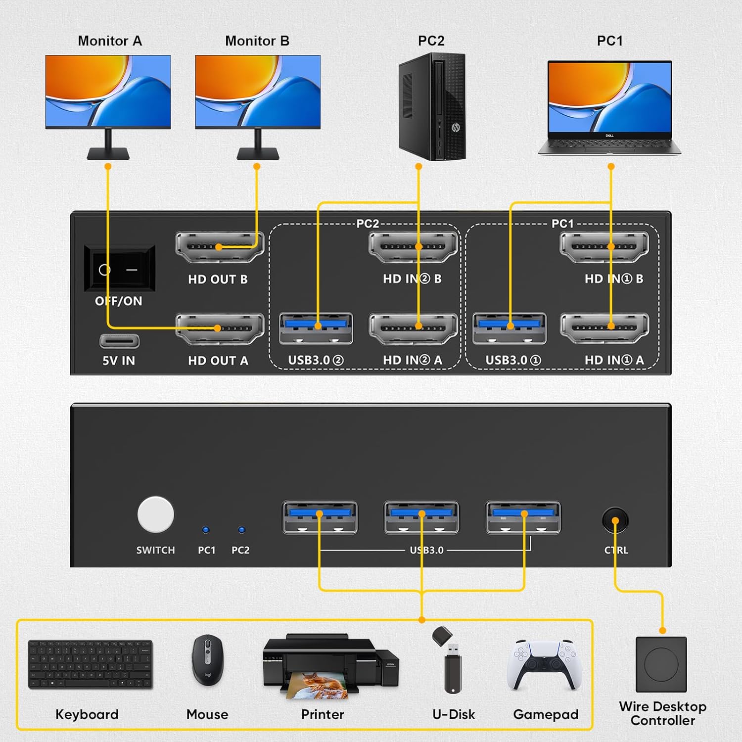 - 【8K@60Hz HDMI KVM-Switch für Dual Monitor】Tauchen Sie ein in die atemberaubende Welt der 8K-Bildqualität mit unserem HDMI KVM-Switch. Erleben Sie lebhafte Farben und feine Details wie nie zuvor. Mit Unterstützung für Auflösungen von bis zu