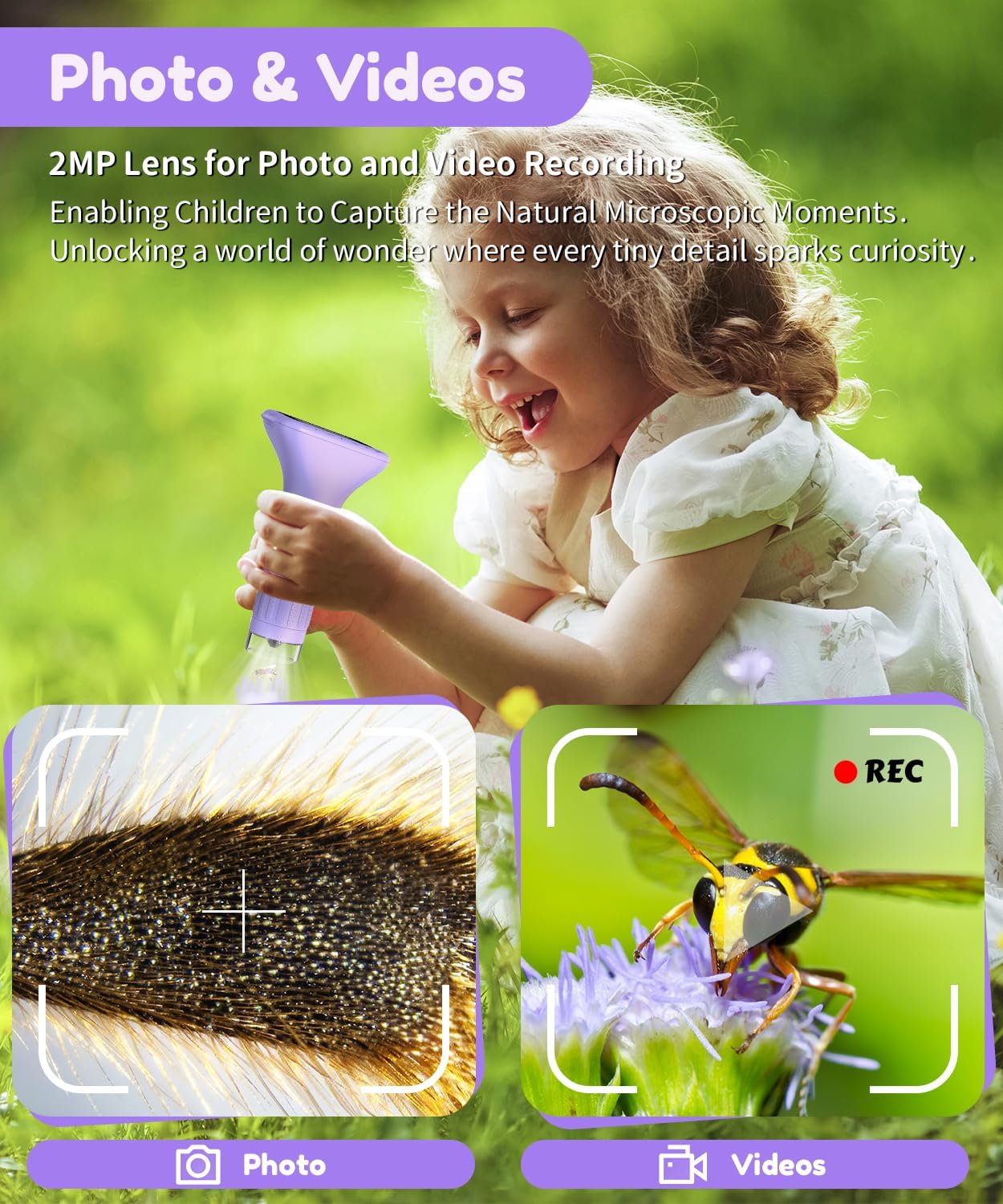 - 【Foto- und Videofunktion】Dieses Kinder-Miniskop verfügt über eine 2-MP-Kamera für Fotos und eine Videofunktion, mit der Kinder mikroskopische Momente der Natur einfangen können – detaillierte Fotos der feinen Haare an Insektenbeinen oder Videos