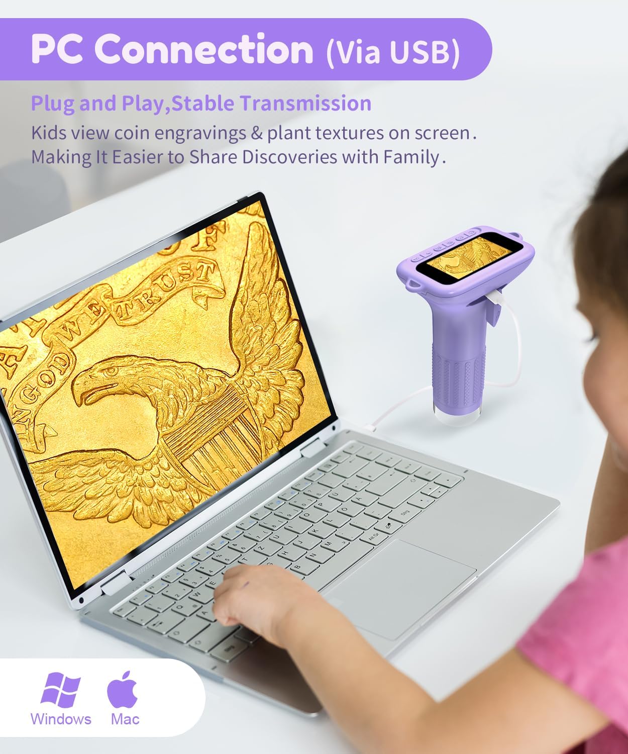 - 【PC-Anschluss】Das 1000-fache USB-Digitale Mikroskop verbindet sich über USB, um Fotos zu speichern und den Computermodus zu aktivieren. Kinder können Münzgravuren und Pflanzentexturen auf einem Monitor mit einem breiteren Blickfeld beobachten, um