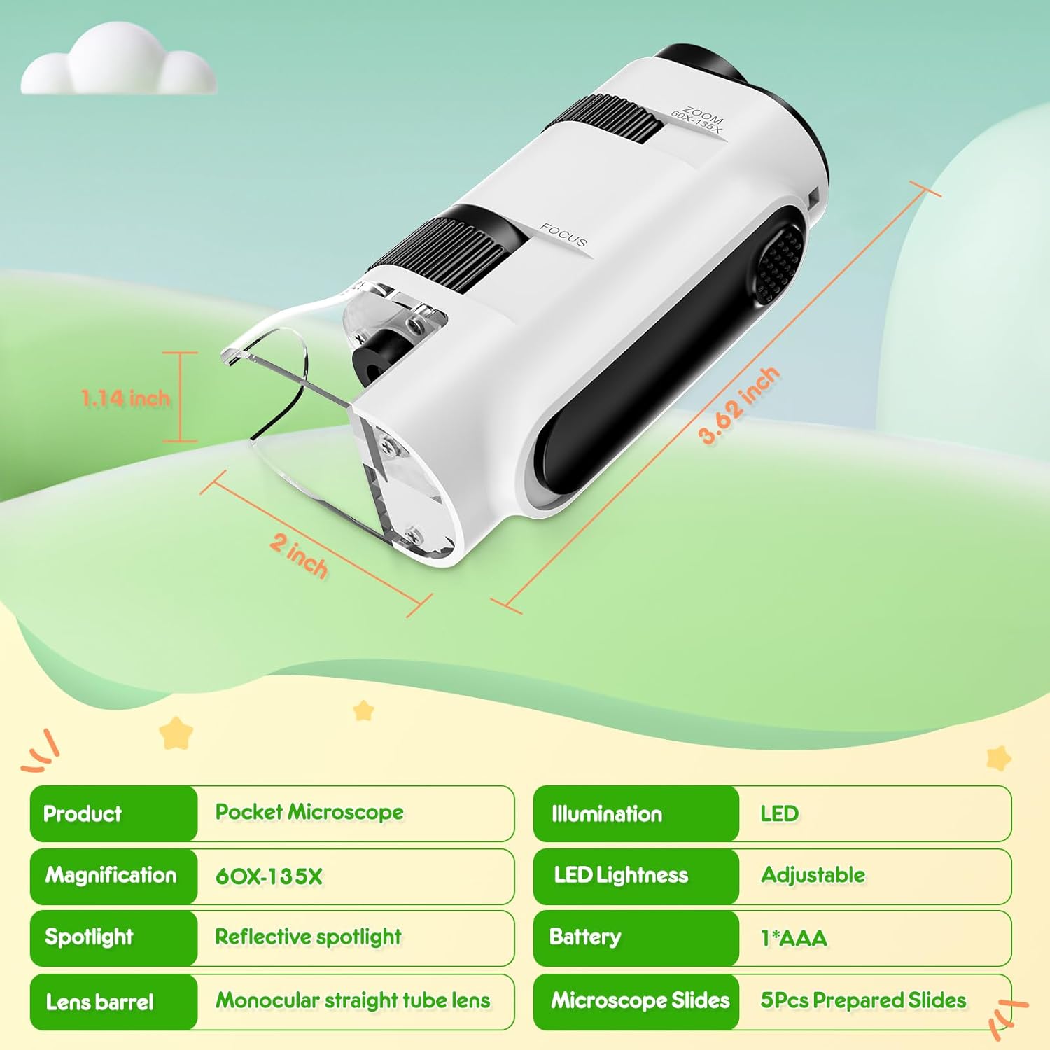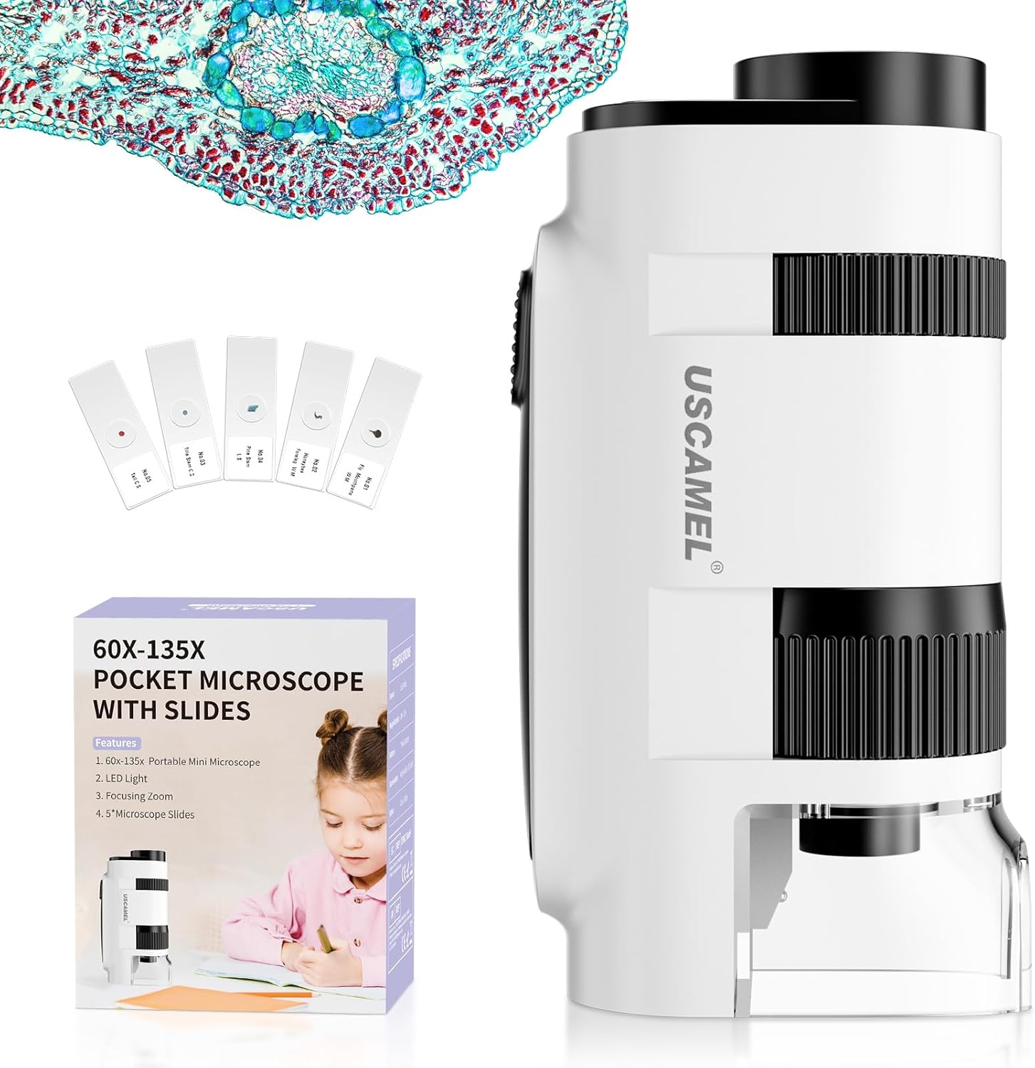 - 【Leistungsstarke Vergrösserung】: Dieses Taschenmikroskop bietet eine Vergrösserung von 60x bis 135x, sodass Sie einzelne Zellen deutlich sehen können. Es ist einfach zu fokussieren und die Objektträger zu wechseln, und es wird mit 5 vorbereiteten