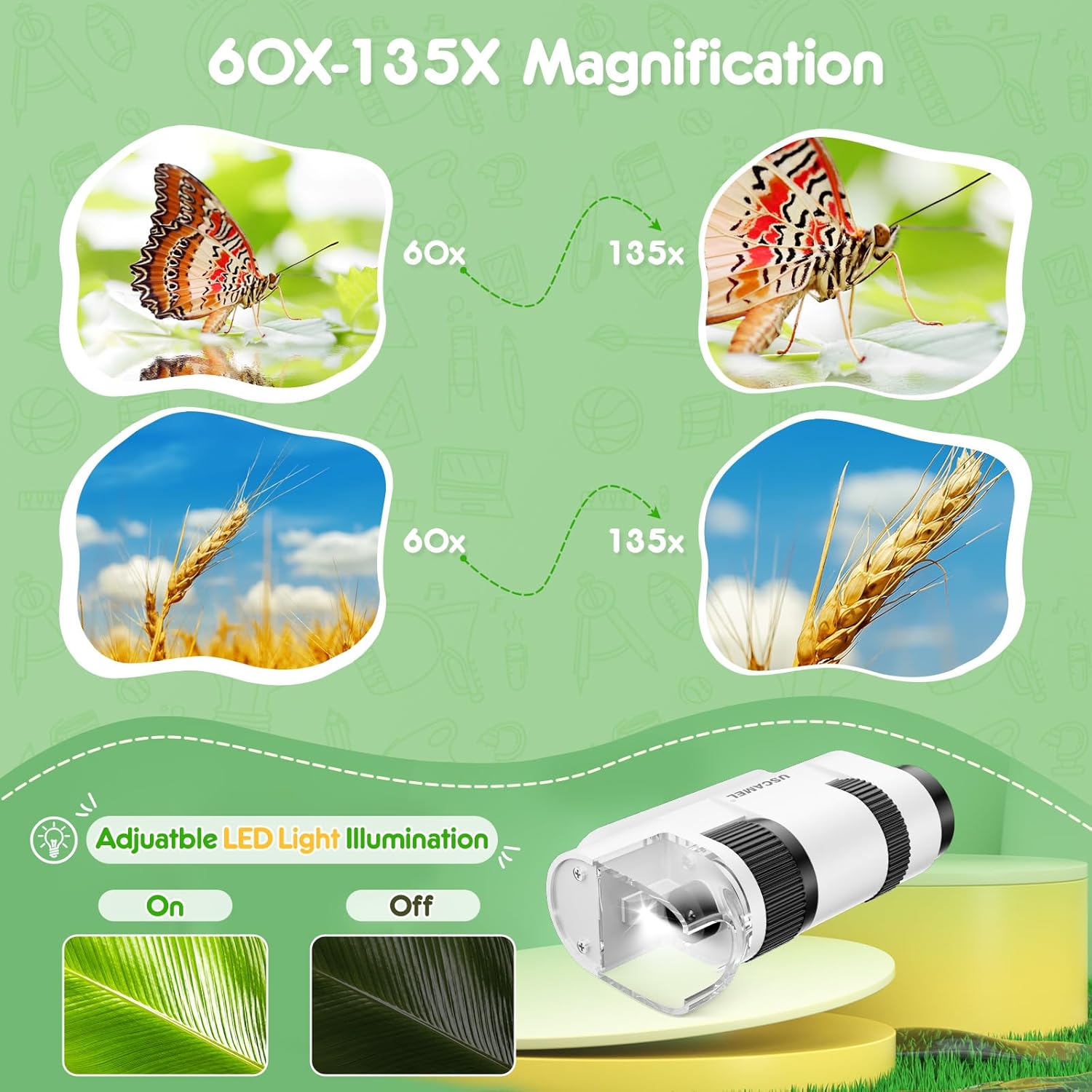 - 【Eingebaute LED-Beleuchtung】: Dieses Handmikroskop verfügt über eine LED-Lichtquelle, die Ihr Beobachtungsobjekt auf Knopfdruck beleuchtet, was die Beobachtung auch bei schlechten Lichtverhältnissen oder nachts erleichtert.
