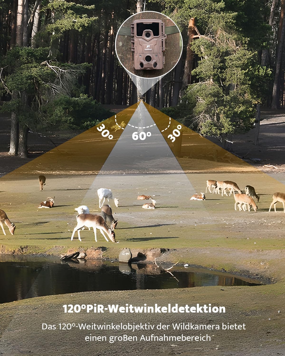 - Breiter Erfassungswinkel und schnelle Erkennung: Mit einem Sichtfeld von 120° und einer Auslösegeschwindigkeit von 0,3 Sekunden bietet diese Fotofalle eine ideale Abdeckung für Videoüberwachung und Jagd in natürlichen Umgebungen. Sie werden nie eine
