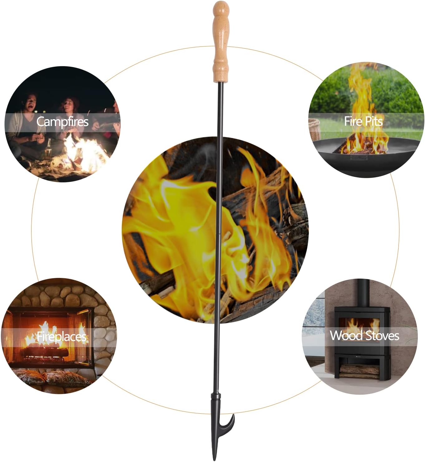 - Schürhaken: Längeres Schürhaken(32inch, 81cm) erleichtert das Bewegen von Stämmen oder Rosten. Der Holzgriff hält die Hitze fern und erhöht die Stabilität beim Gebrauch. Gewicht: 0,6kg