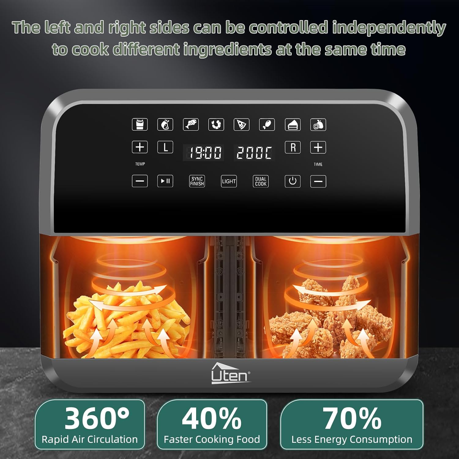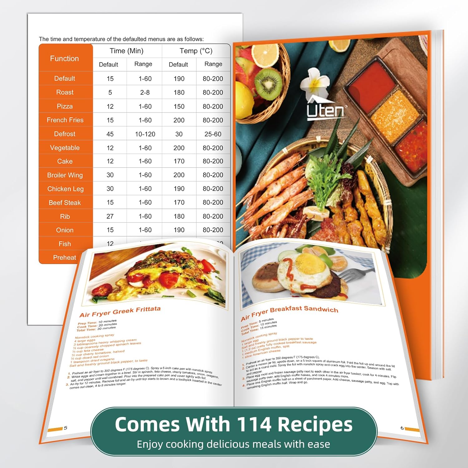 - 【Gesunde Ernährung】 Im vergleich zu herkömmlichen kochmethoden kocht die uten air fryer mit heisser luft und dem eigenfett der lebensmittel und benötigt nur eine kleine menge öl, um die mahlzeit fertigzustellen, wodurch ihre fettaufnahme um 75 %