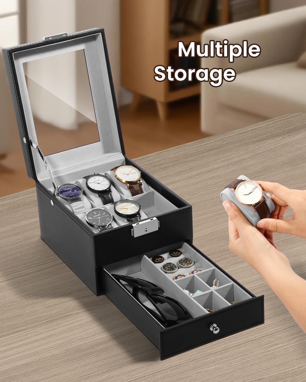 - 【Doppelschicht-Design】 Doppelschicht ausziehdesign, einfach zu bedienen und mit grossem fassungsvermögen. die obere schicht bietet platz für 6 uhren, und die verbreiterten und vertieften fächer bieten platz für verschiedene uhrentypen mit einem