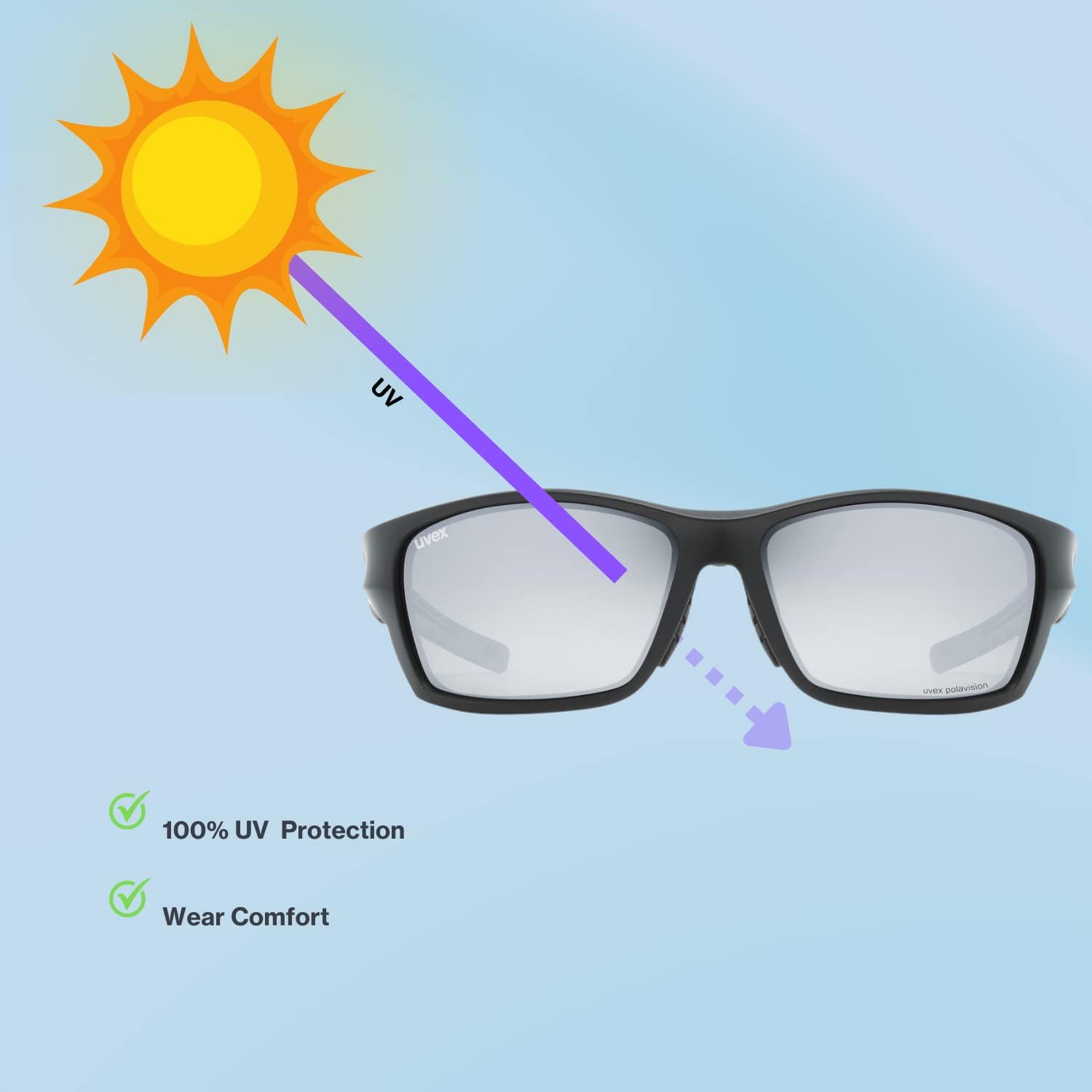 PRODUKTBESCHREIBUNGEN Die uvex sportstyle 232 P ist ein cooler Alleskönner und garantiert einhundertprozentigen Schutz vor schädlichen UVA-, UVB-, und UVC-Strahlen. Dank uvex polavision® Technologie werden Blendungen und Spiegelungen effektiv reduziert, so dass die Augen zuverlässig vor Überanstrengung geschützt sind. Die leichte, ergonomische Fassung kommt mit einstellbaren Nasenpads für einen optimalen Sitz.