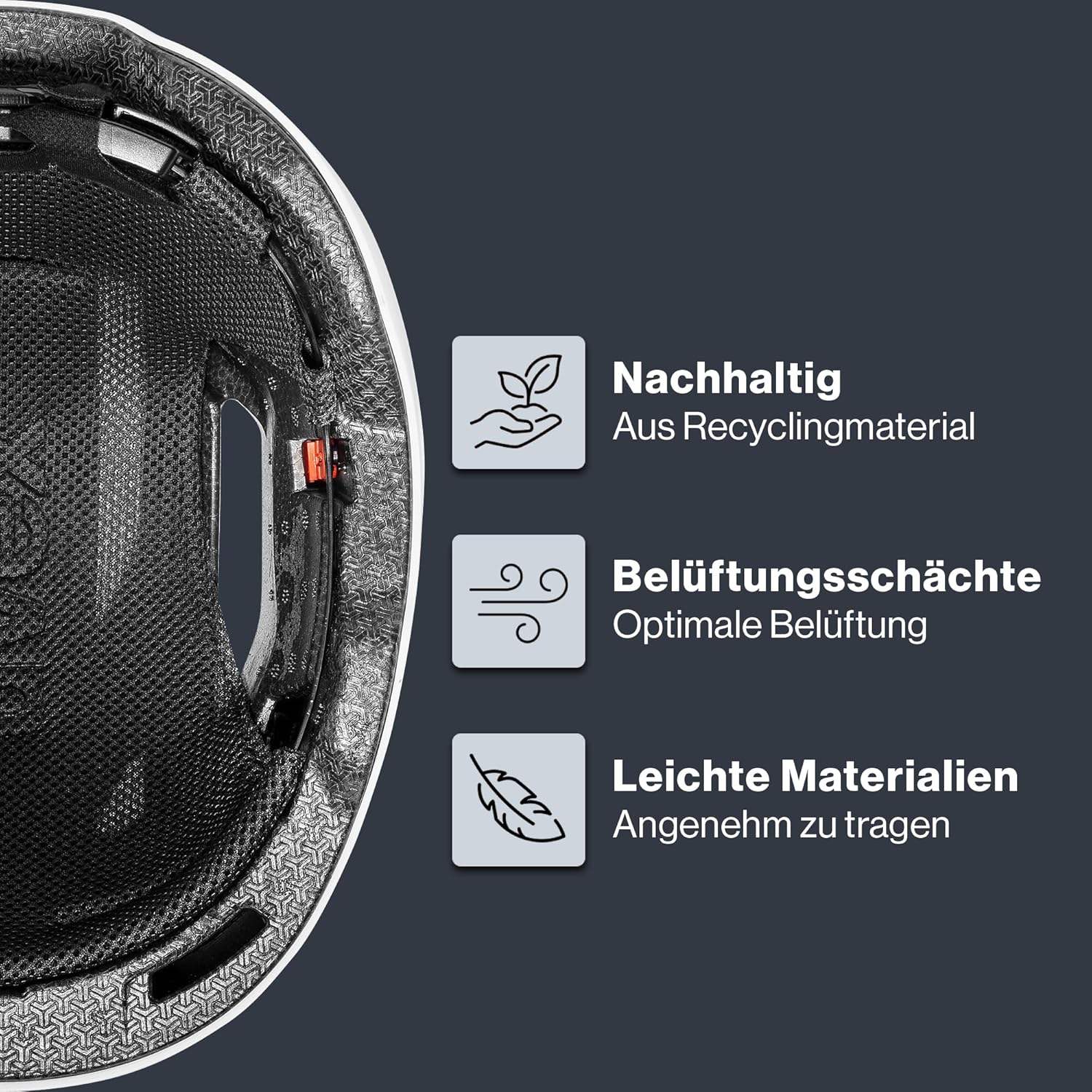 - Nachhaltig & ressourcenschonend: Biobasierte Helm-Hartschale sowie eine Innenausstattung und Gurtbänder aus Recyclingmaterial