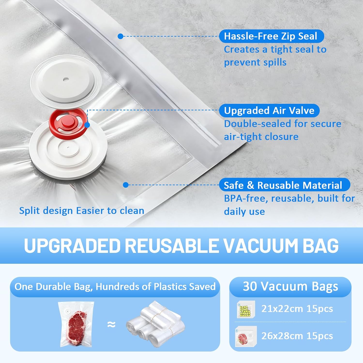 - Nachhaltig Nutzbar: Die zum Vakuumiergerät gehörenden Vakuumbeutel bestehen aus BPA-freiem, lebensmittelechtem Material, sind sicherheitsgeprüft und können bedenkenlos mit Lebensmitteln verwendet werden. Im Lieferumfang sind 30 wiederverwendbare