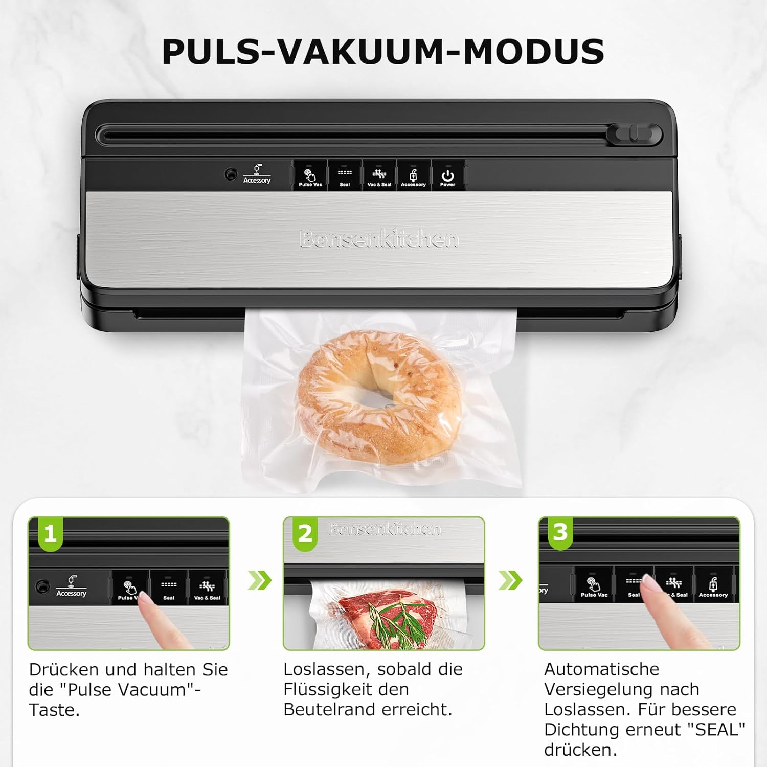 - Starke Saugkraft und schnelles Versiegeln: Die Vakuumiermaschine von Bonsenkitchen ist mit Globefish-Technologie für kontinuierliches Arbeiten mit hoher Geschwindigkeit ausgestattet, bietet starke und stabile Saugkraft und vakuumiert Lebensmittel