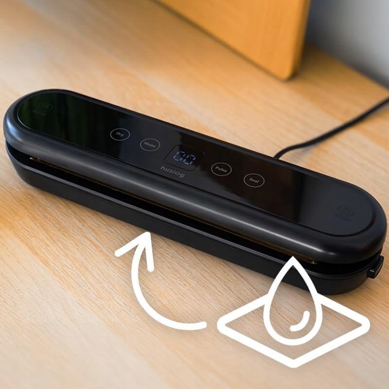 - Abtropfschale – Sauberkeit und Effizienz beim Verpacken - Die Huslog-Schweissmaschine ist mit einer praktischen Abtropfschale ausgestattet, die überschüssige Feuchtigkeit beim Verpacken von feuchten Produkten auffängt. Diese Lösung garantiert