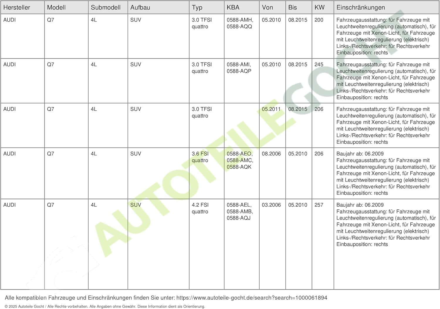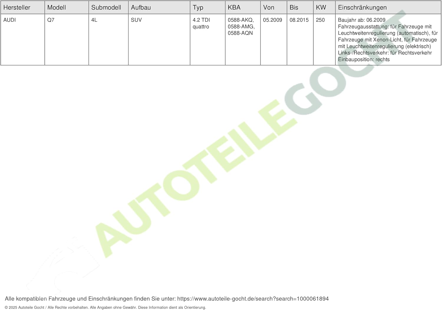 - Ergänzungsartikel/Ergänzende Info 2: ohne Steuergerät für Xenon; mit Steuergerät für autom.LWR; mit Stellmotor für LWR