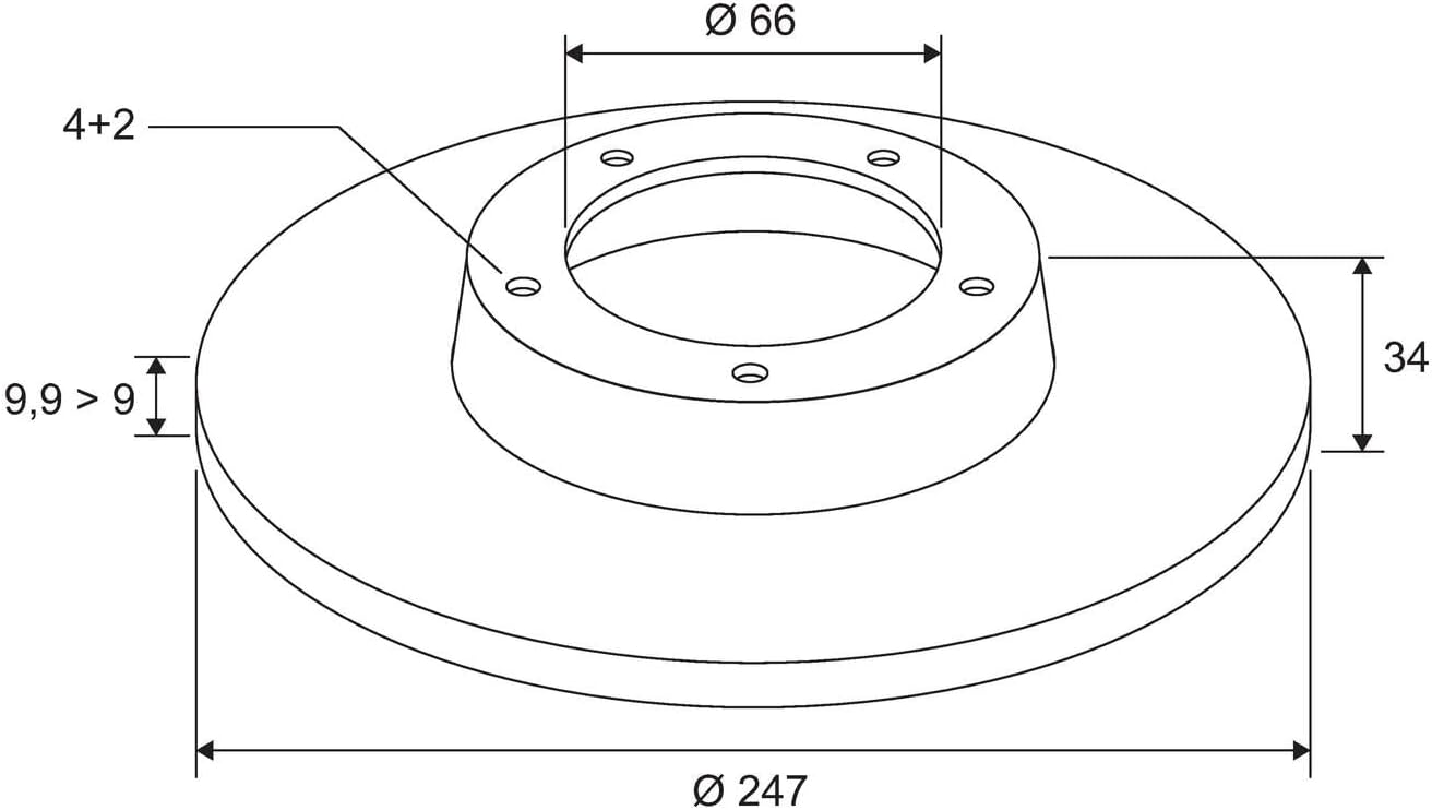 - Aussendurchmesser [mm]: 247 / Bremsscheibendicke [mm]: 9,9 / Zentrierdurchmesser [mm]: 66/ Höhe [mm]: 34