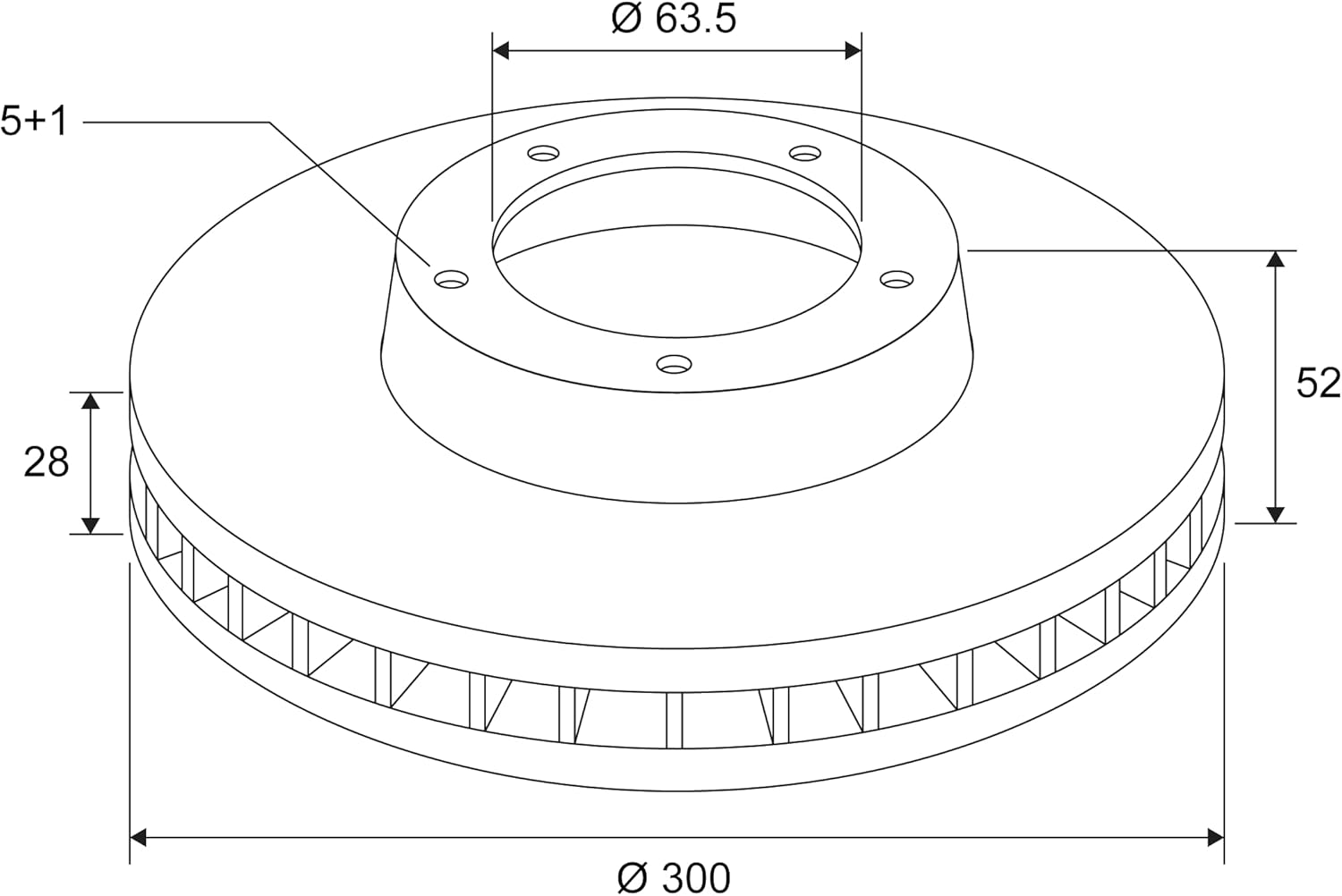 - Aussendurchmesser [mm]: 300 / Bremsscheibendicke [mm]: 28 / Zentrierdurchmesser [mm]: 63,5/ Höhe [mm]: 52