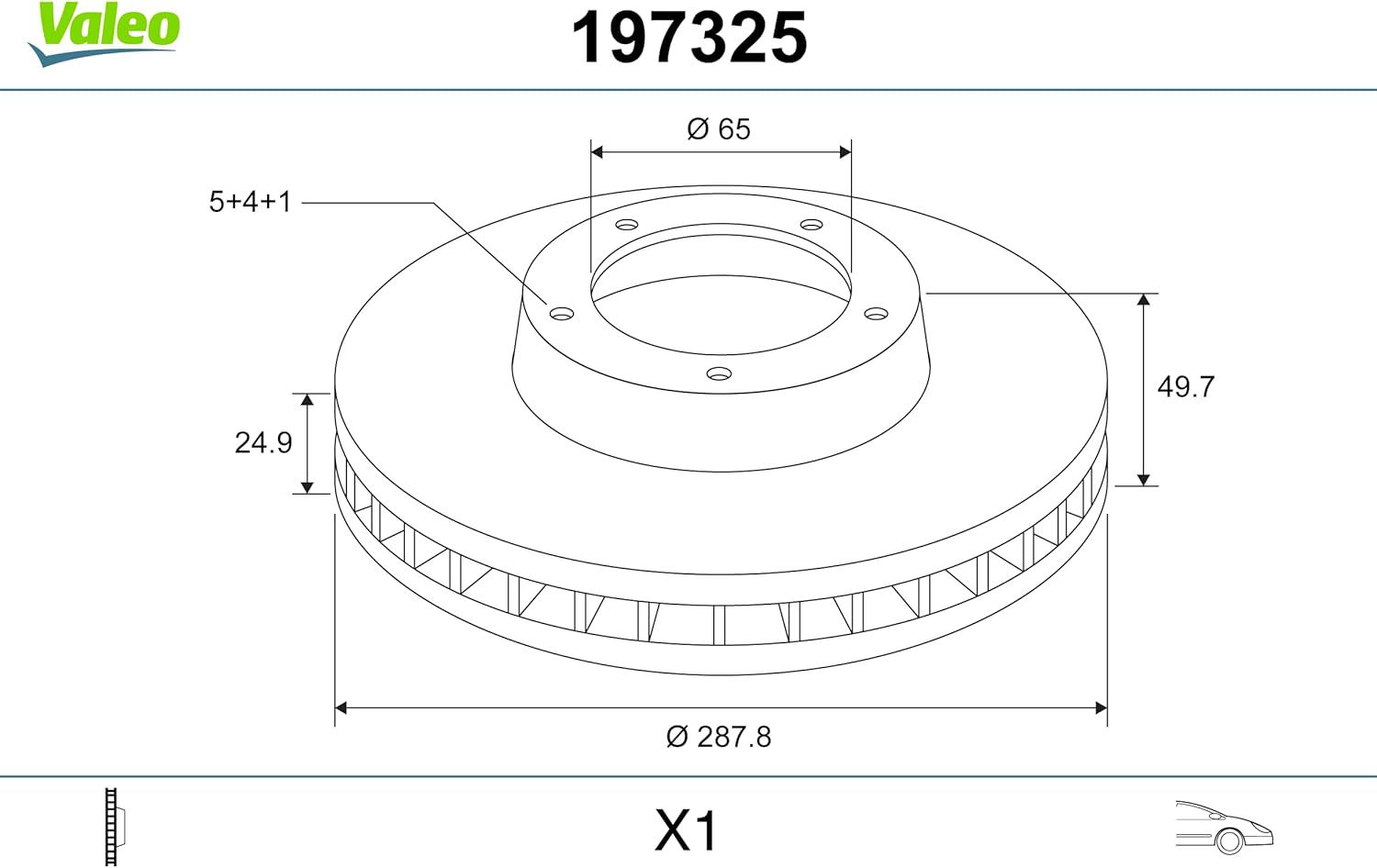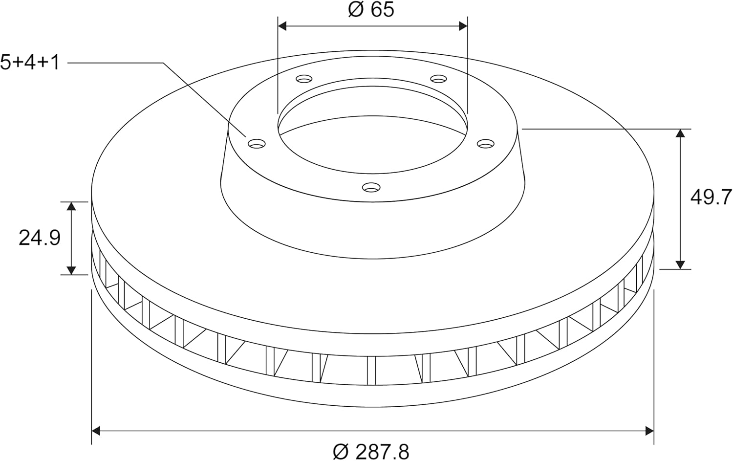- Aussendurchmesser [mm]: 287,8 / Bremsscheibendicke [mm]: 24,9 / Zentrierdurchmesser [mm]: 65/ Höhe [mm]: 49,7