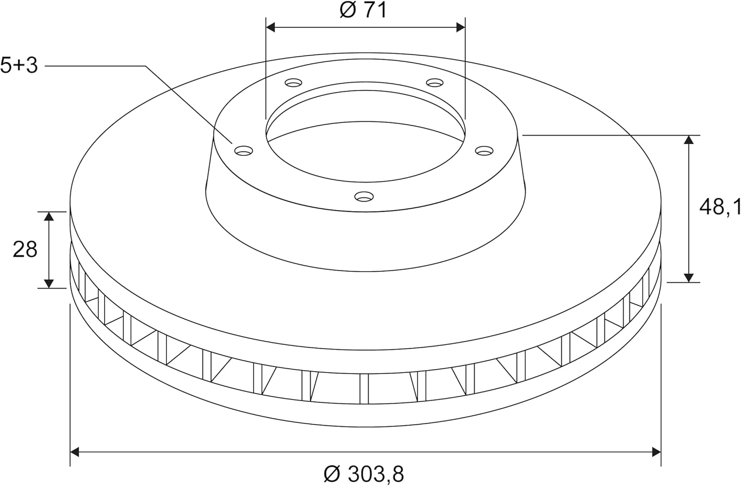 - Aussendurchmesser [mm]: 303,8 / Bremsscheibendicke [mm]: 28 / Zentrierdurchmesser [mm]: 71/ Höhe [mm]: 48,1