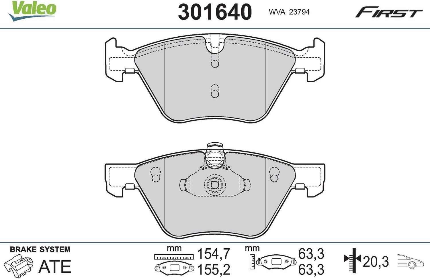 - Abmessungen der Valeo Bremsbeläge: Breite [mm]: 154,7/ Höhe [mm]: 63,3/ Dicke [mm]: 20,3 (Design wie bei den OE Teilen)