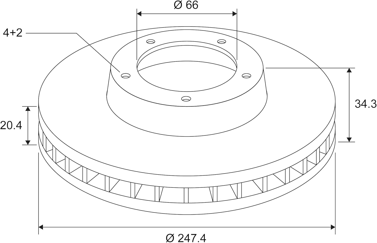 - Aussendurchmesser [mm]: 247,4 / Bremsscheibendicke [mm]: 20,4 / Zentrierdurchmesser [mm]: 66/ Höhe [mm]: 34,3