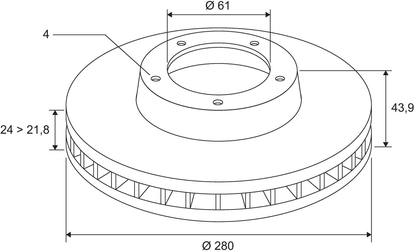 - Aussendurchmesser [mm]: 280; Höhe [mm]: 43,9; Bremsscheibenstärke [mm]: 24; Zentrierdurchmesser [mm]: 61