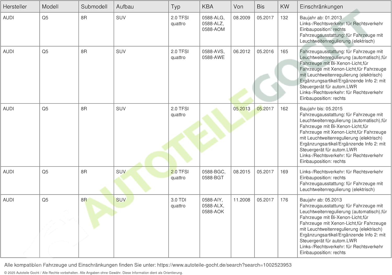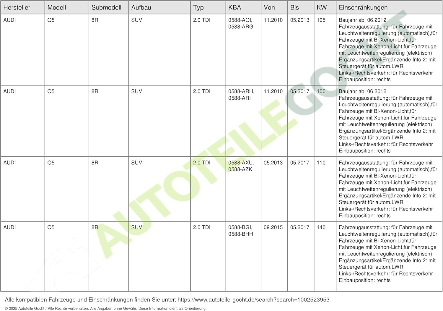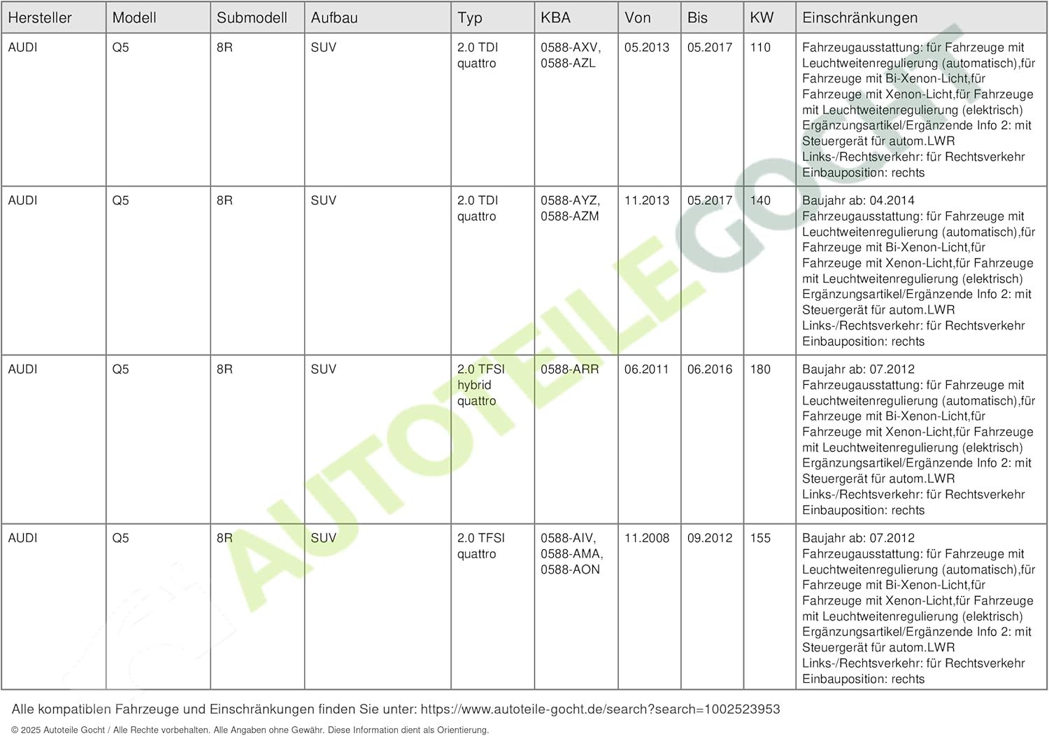 - Ergänzungsartikel/Ergänzende Info 2: ohne Steuergerät für Xenon; mit Steuergerät für autom.LWR; mit Stellmotor für LWR