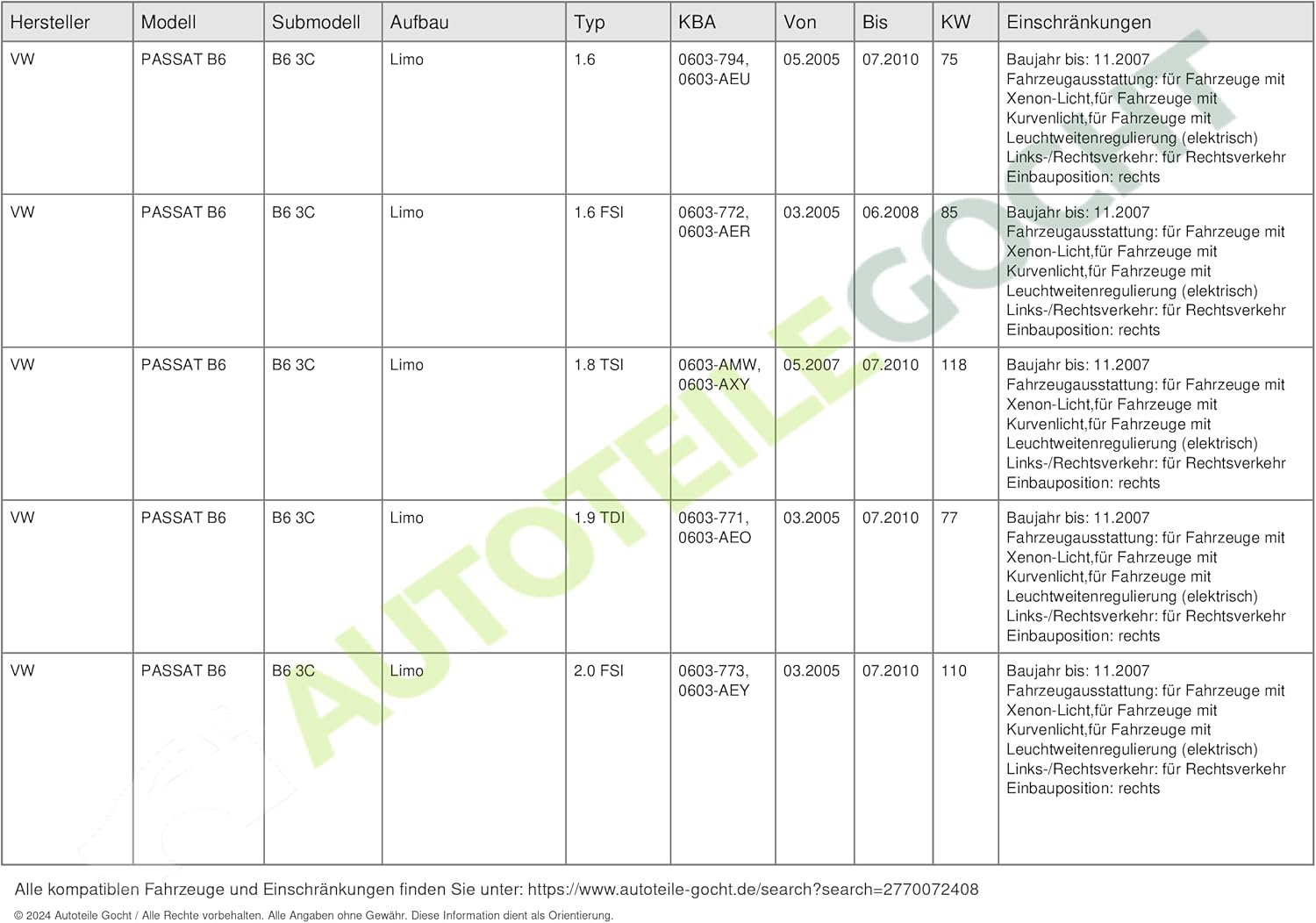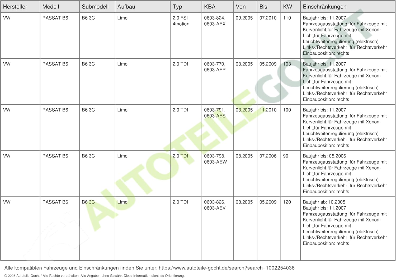• Ergänzungsartikel/Ergänzende Info 2: ohne Steuergerät für Xenon; mit Stellmotor für LWR