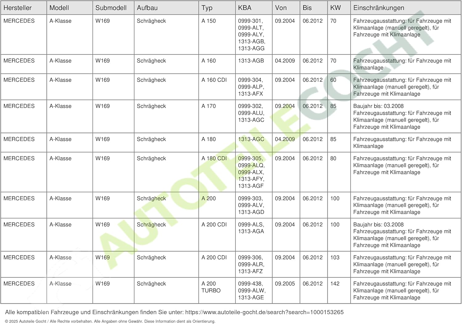 • OE VERGLEICHSNUMMERN: 715294, 1698200397, A1698200397