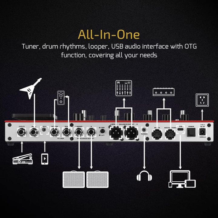 - 4,3 Zoll TFT LCD-Farbbildschirm mit benutzerfreundlichem UI, 8 anpassbare LED-Fussschalter, Line, XLR und Kopfhörer E/A für verschiedene Anschlussanforderungen, FX-Loop für den Anschluss externer Stompboxen, MIDI IN und EXP2-Buchse für den Anschluss