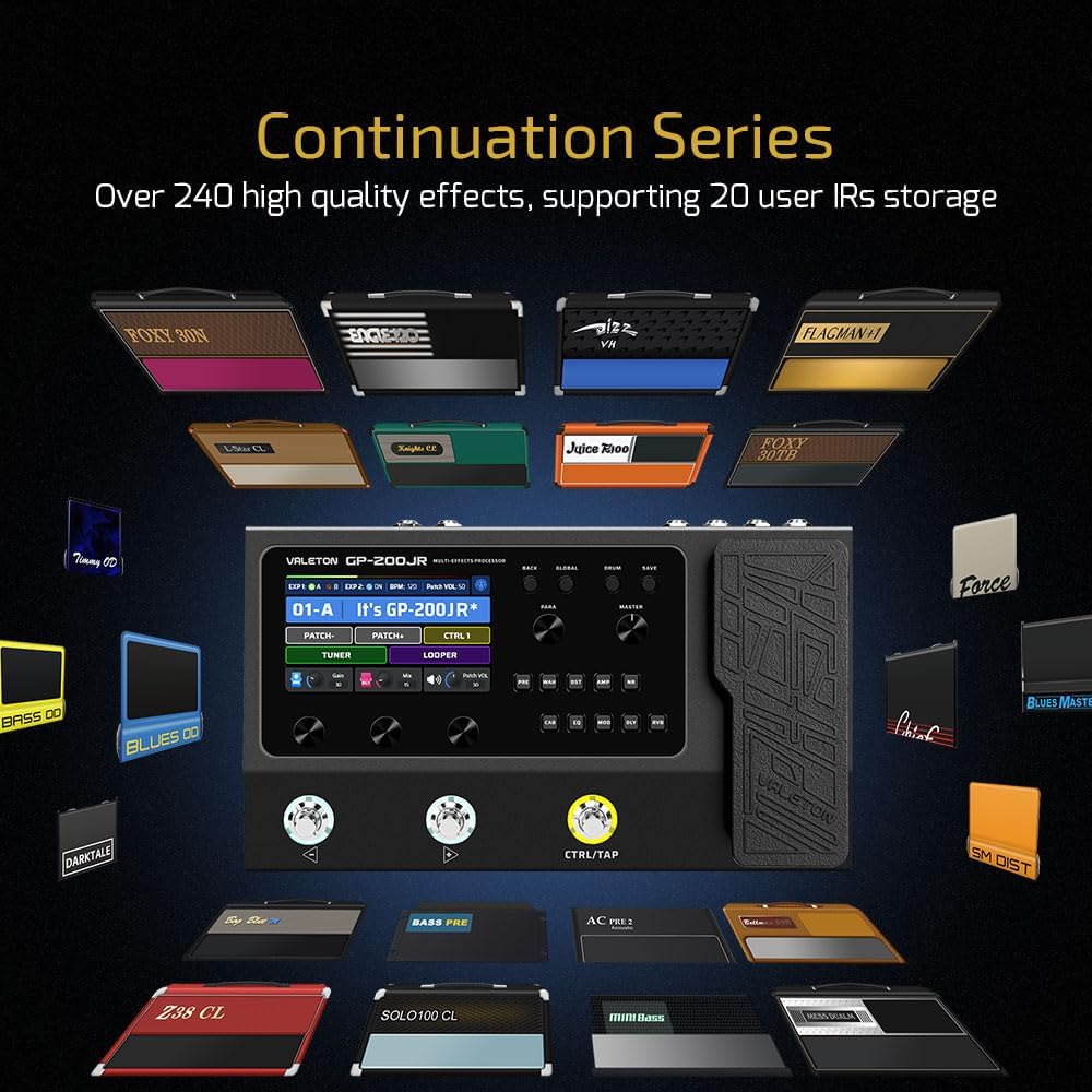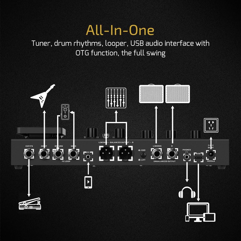 - 4,3-Zoll TFT Farb LCD Bildschirm mit benutzerfreundlichem UI, Line- und Kopfhörer-E/A für verschiedene Anschlussanforderungen, FX-Loop zum Einfügen externer Stompboxen, MIDI-E/A und zwei EXP-Buchsen zum Anschluss externer Controller