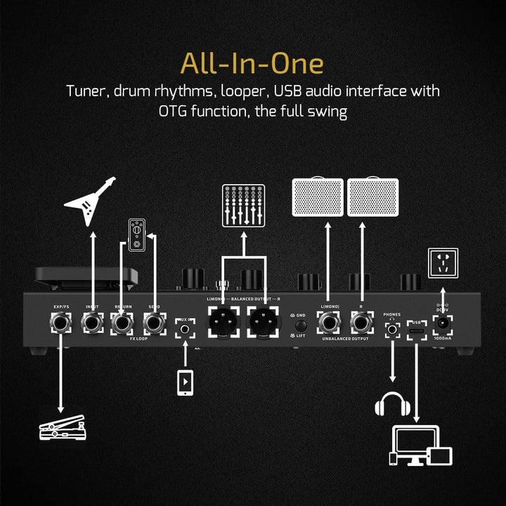 - 240+ eingebaute Gitarren-/Bass-/Akustik-Effekte mit 140 legendären Verstärker- und Boxensimulationen und 100 bekannten Stompbox-Effektpedalen; Unterstützung von 20 IRs von Drittanbietern; 24-bit 44.1kHz Signalverarbeitung