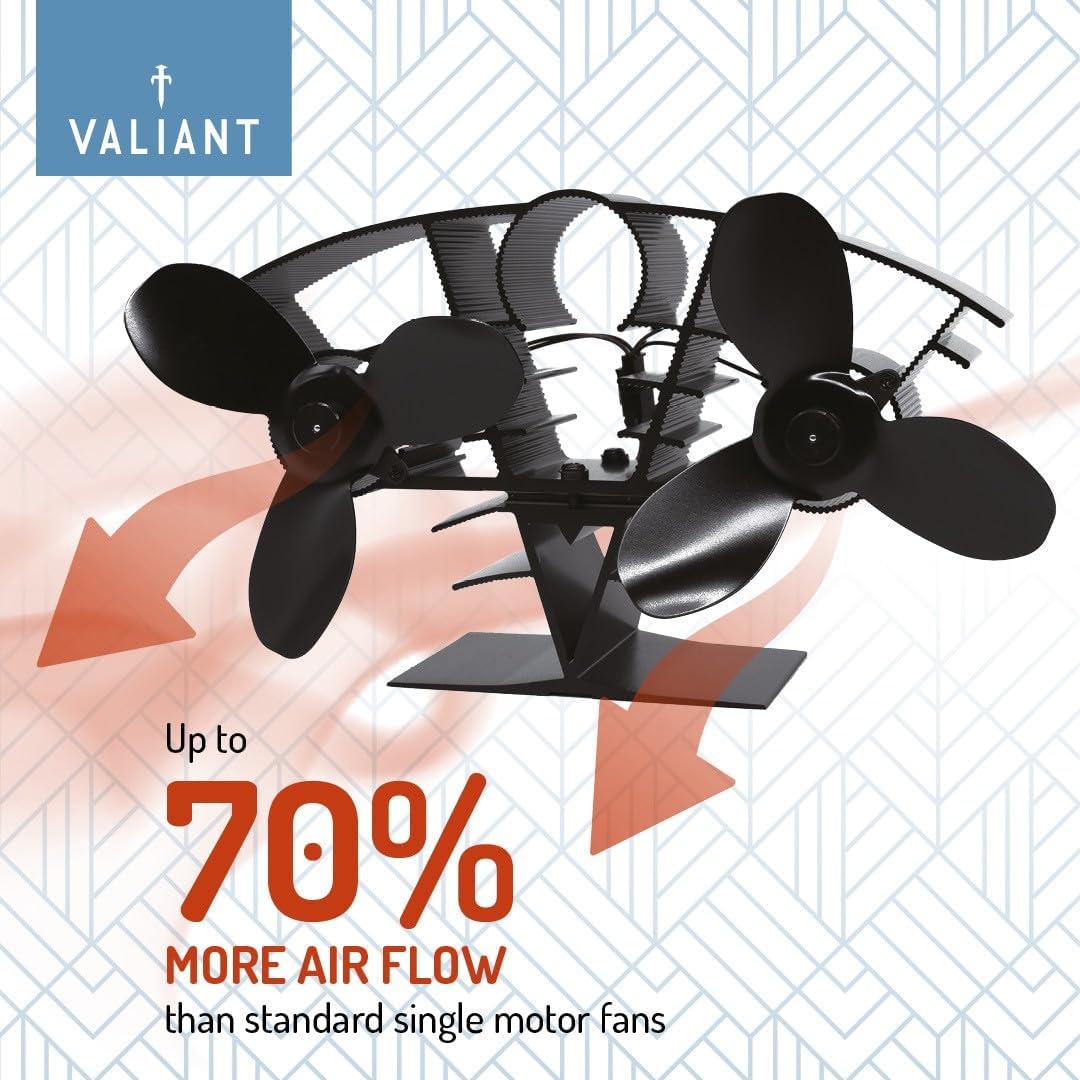 - Das einzigartige Design des Valiant Whirlwind-Lüfters bietet bis zu 70 % mehr Luftstrom als Konkurrenzprodukte ohne Betriebskosten, da der Ventilator vollständig wärmebetrieben ist, was bedeutet, dass keine Batterien oder Netzanschluss erforderlich
