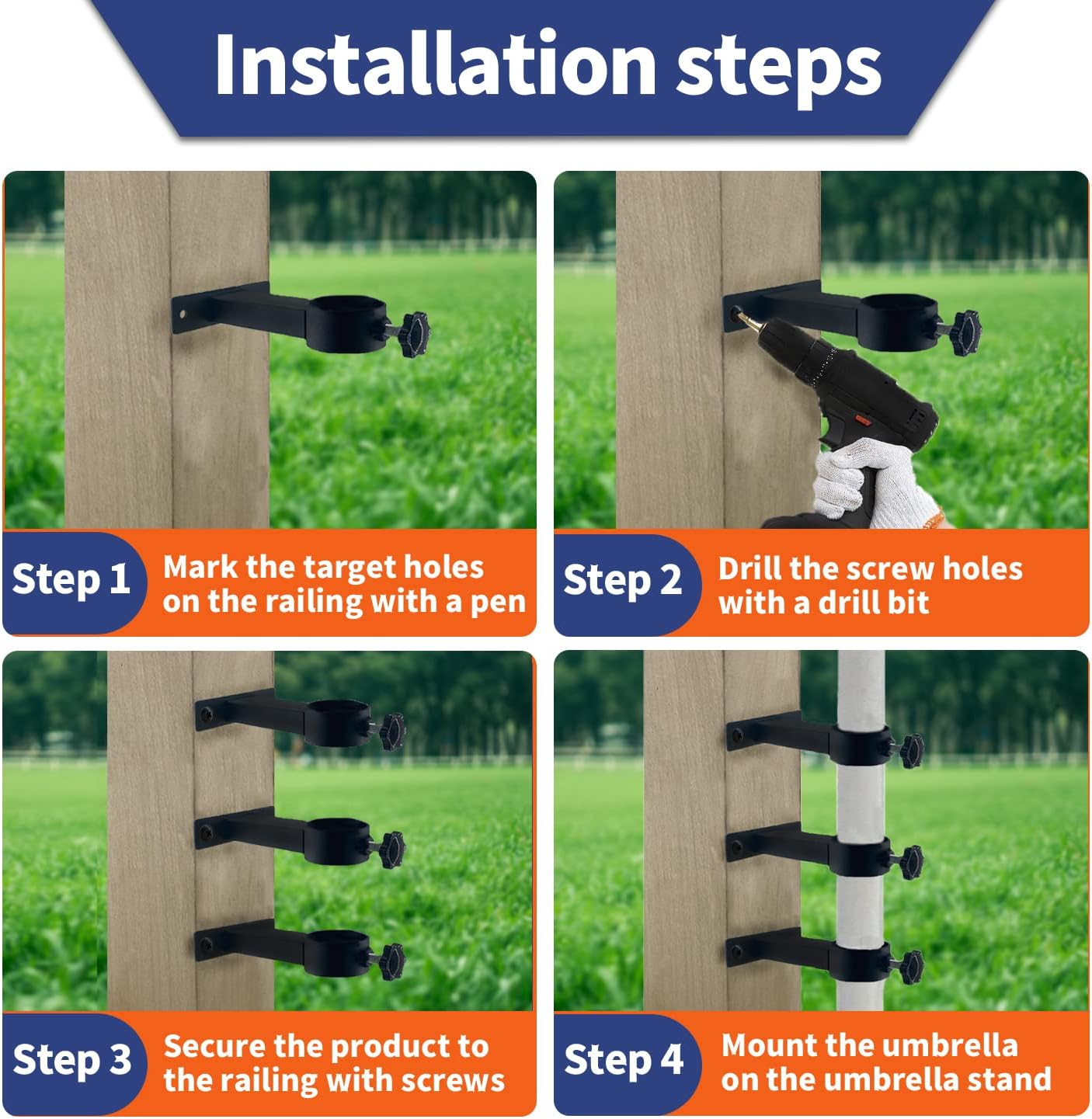 • 【Flexibles Design】Diese robuste Schirmhalterung ist geeignet für 3,8–5,1 cm Schirmstangen mit verschiedenen Durchmessern, kann fest am Balkongeländer und einer Bank befestigt werden. 3 Stück Schirmklammern werden zur gleichen Zeit verwendet, um
