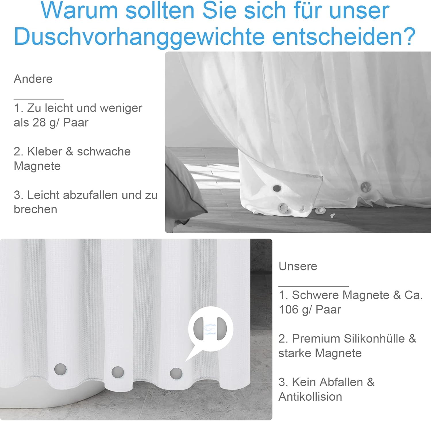 • STARKE MAGNETE: Der Magnetismus unserer Vorhangmagnete ist doppelt so stark wie der der anderen auf dem Markt. Selbst bei sehr dicken Stoff-/Kunststoffvorhängen unter fliessendem Wasser ziehen sich unsere Duschvorhangmagnete fest an und rutschen nicht