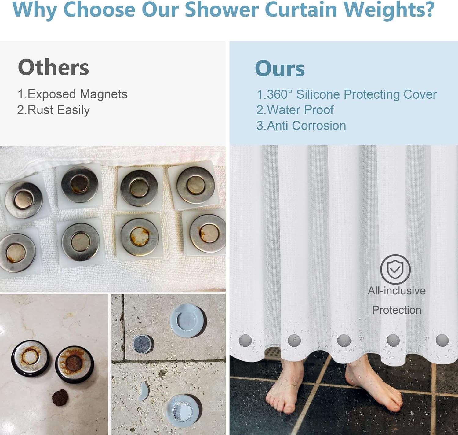 - RICHTIGES GEWICHT: Jedes Paar magnetischer Vorhanggewichte wiegt etwa 53 g, was dem doppelten Gewicht der meisten Vorhanggewichte auf dem Markt entspricht. Laut Benutzerfeedback ist es das am besten geeignete Gewicht, um die Duschvorhangeinlage an Ort