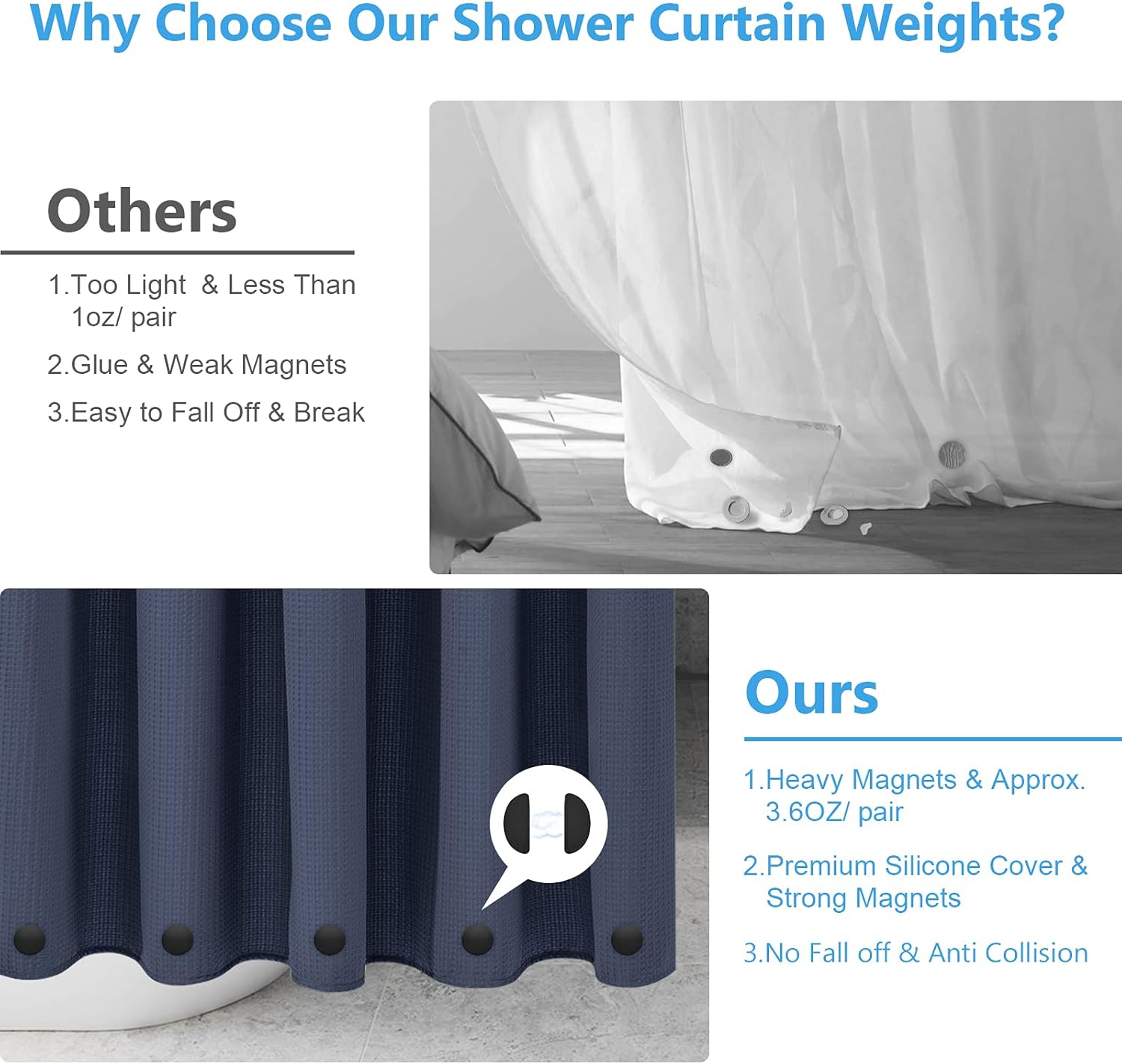 - RICHTIGES GEWICHT: Jedes Paar magnetischer Vorhanggewichte wiegt etwa 53 g, was dem doppelten Gewicht der meisten Vorhanggewichte auf dem Markt entspricht. Laut Benutzerfeedback ist es das am besten geeignete Gewicht, um die Duschvorhangeinlage an Ort