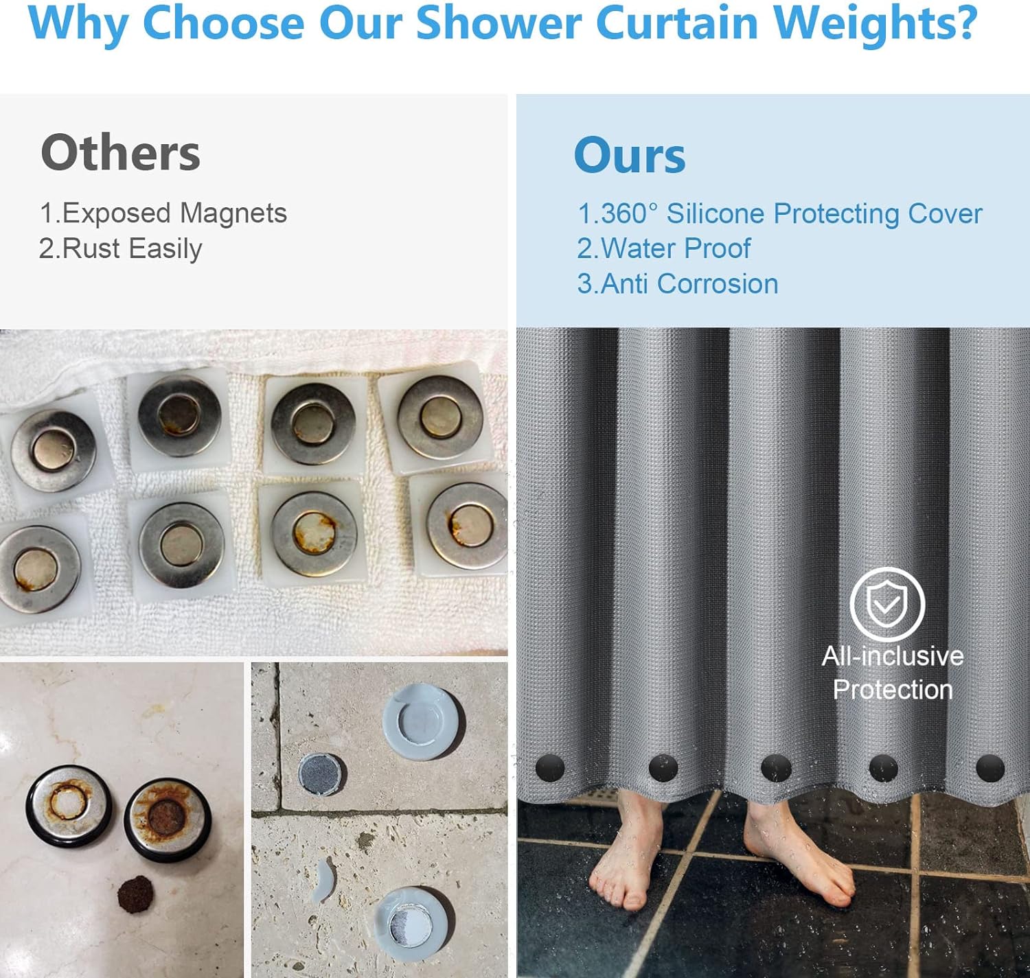 - Rostfrei: Duschvorhangmagnete sind rundum mit hochwertigem Silikon überzogen. Die hermetische Silikonhülle kann die Magnete im Inneren vollständig von Luft und Wasser isolieren, um Korrosion zu vermeiden und eine langfristige Nutzung und Haltbarkeit