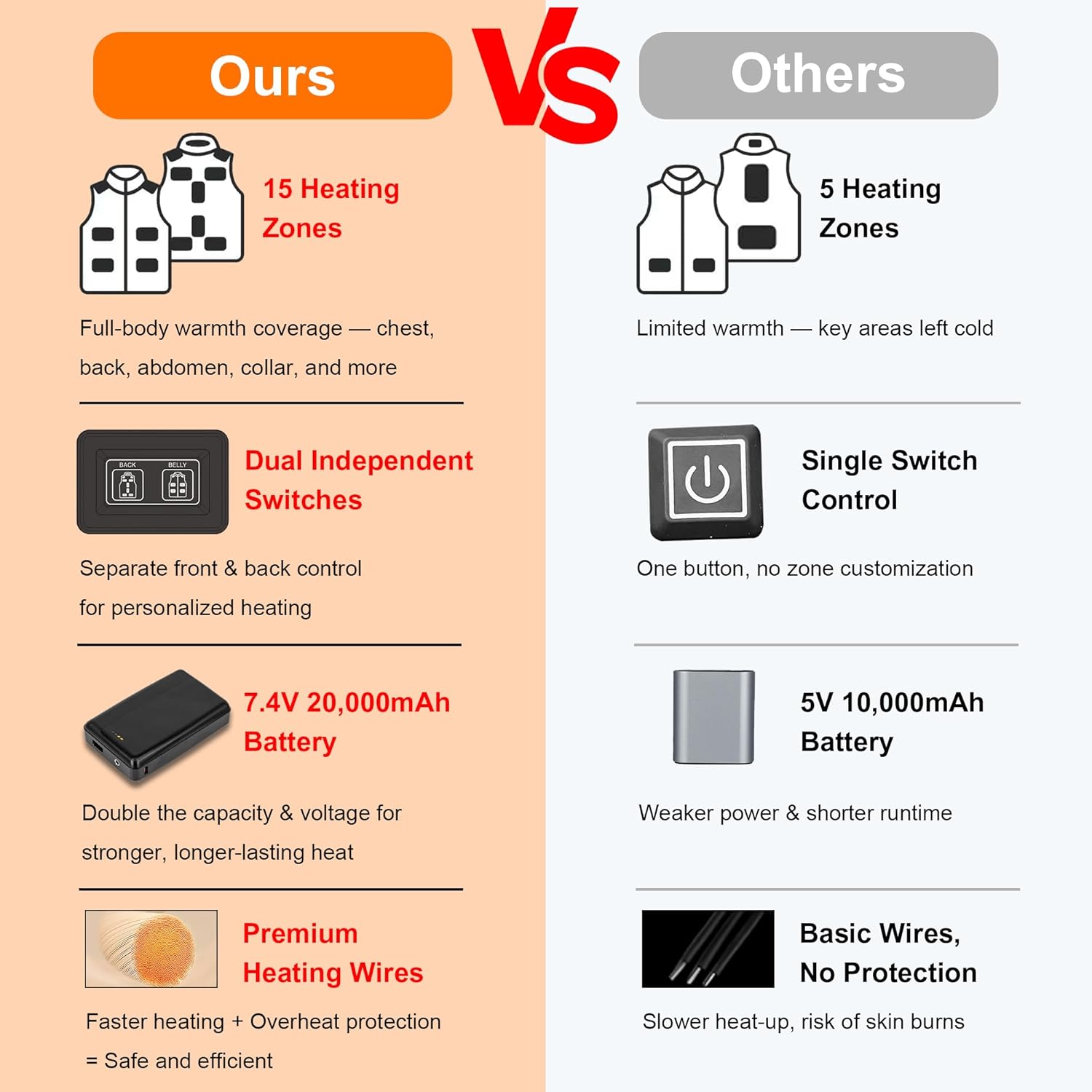 - 【15 Heizkissen für Ganzkörperwärme】 - Diese beheizte Weste wird mit 15 Heizkissen geliefert, die sorgfältig über Bauch, Schultern, Rücken und Nacken gelegt werden, für vollständige Wärme und Komfort. Halten Sie einfach die Power-Taste für 3