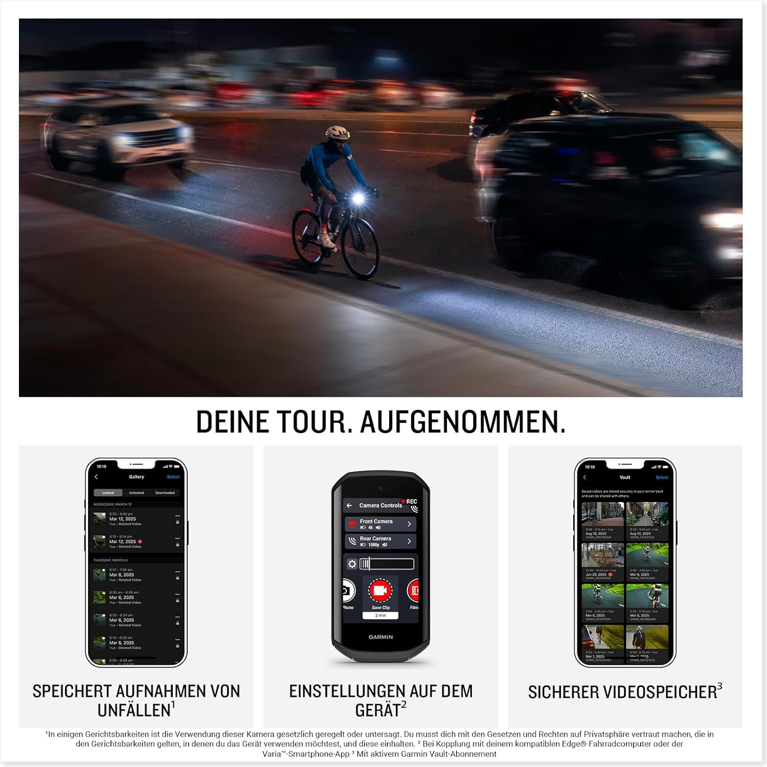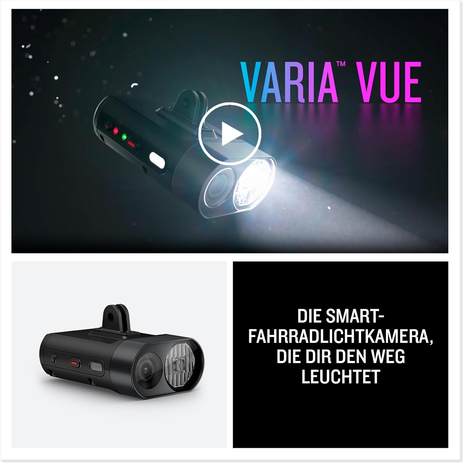 - Gleichzeitige Videoaufnahme der nach vorne gerichteten Varia Vue StVZO und der nach hinten gerichteten Varia RCT716 StVZO (*/**). Steuern Sie die Kamera und das Frontlicht über Ihren kompatiblen Edge Radcomputer.