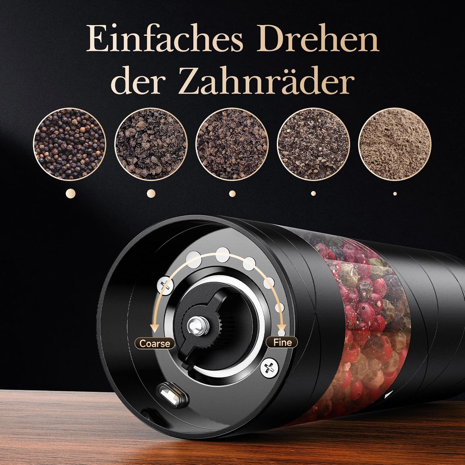 - EINHÄNDIGE BEDIENUNG MIT EINSTELLBARER GRÖSSE: Einfach den Knopf drücken und halten, um frische Gewürze zu erhalten. Drehen Sie den Knopf im oder gegen den Uhrzeigersinn, um die Körnung zu wählen, die Ihrem Geschmack am besten entspricht. Diese