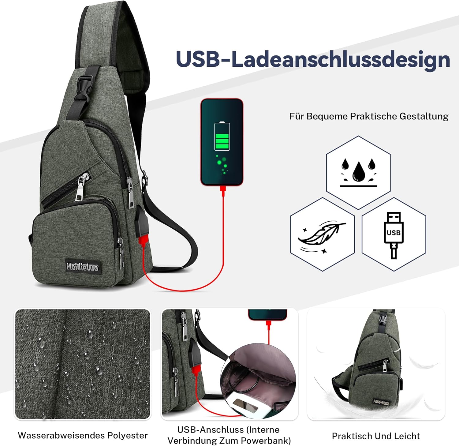 - USB-Anschluss: Praktisch zum Aufladen eines Mobiltelefons oder iPads durch Anschliessen einer Powerbank. Diese Brusttasche hat eine hervorragende wasserdichte Leistung und macht Ihre Reise sorgenfreier.