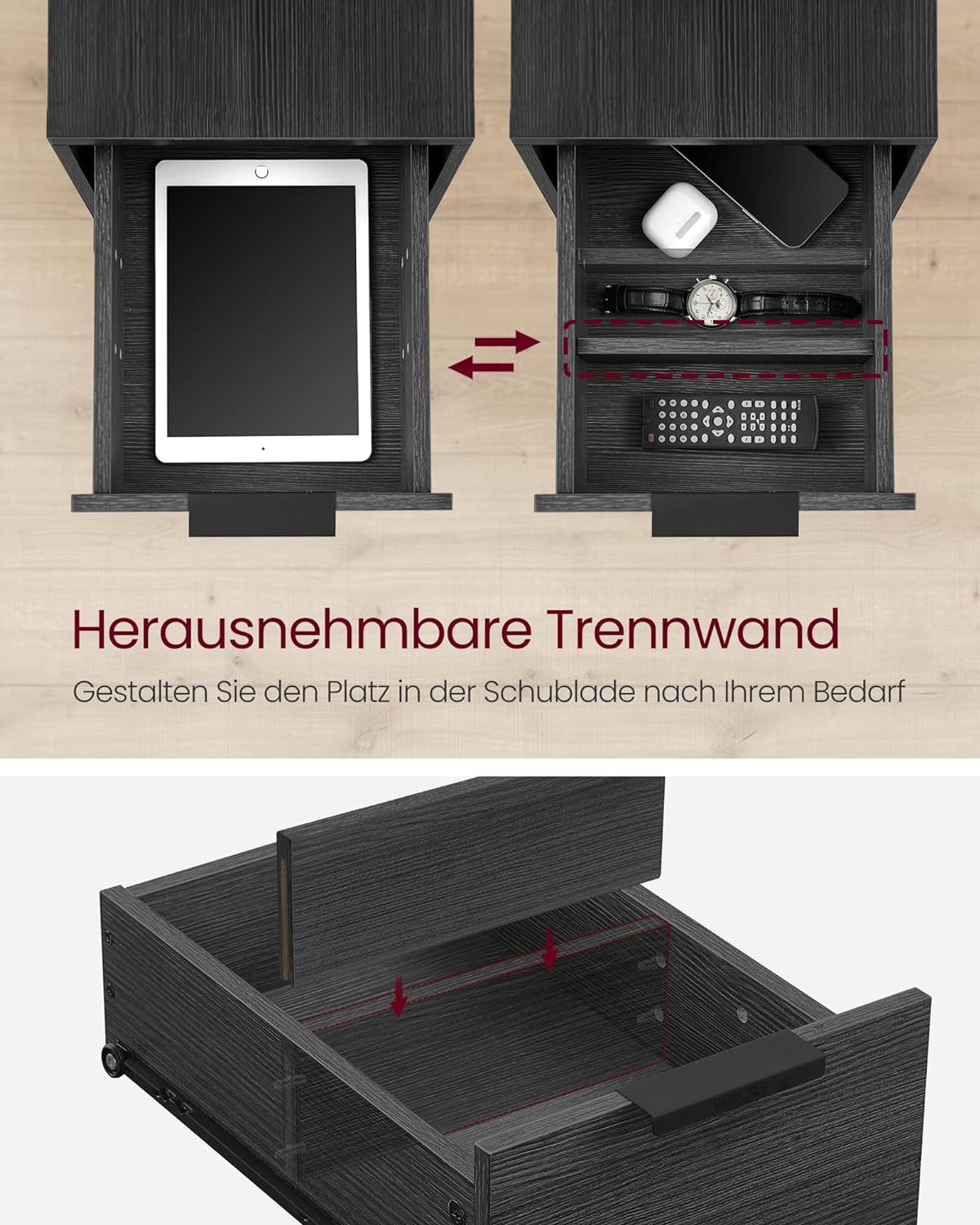- [Viel Stauraum] Unser kompakter Beistelltisch bietet vielseitige Aufbewahrungsmöglichkeiten – 2 Schubladen mit herausnehmbaren Trennwänden, 2 offene Ablagen für einfachen Zugriff und sogar einen Zeitschriftenhalter auf der Rückseite